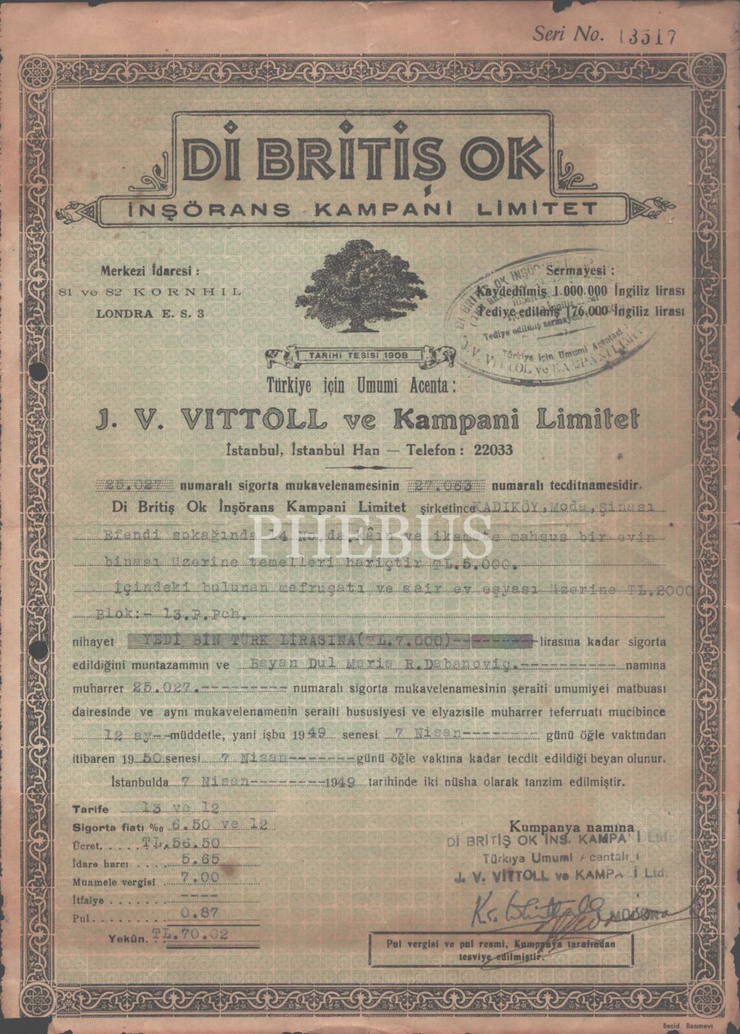 "Di Britiş Ok İnşörans (Sigorta) Kampani Limitet" antetlli sigorta evrakı, 1949, 21x30 cm...
