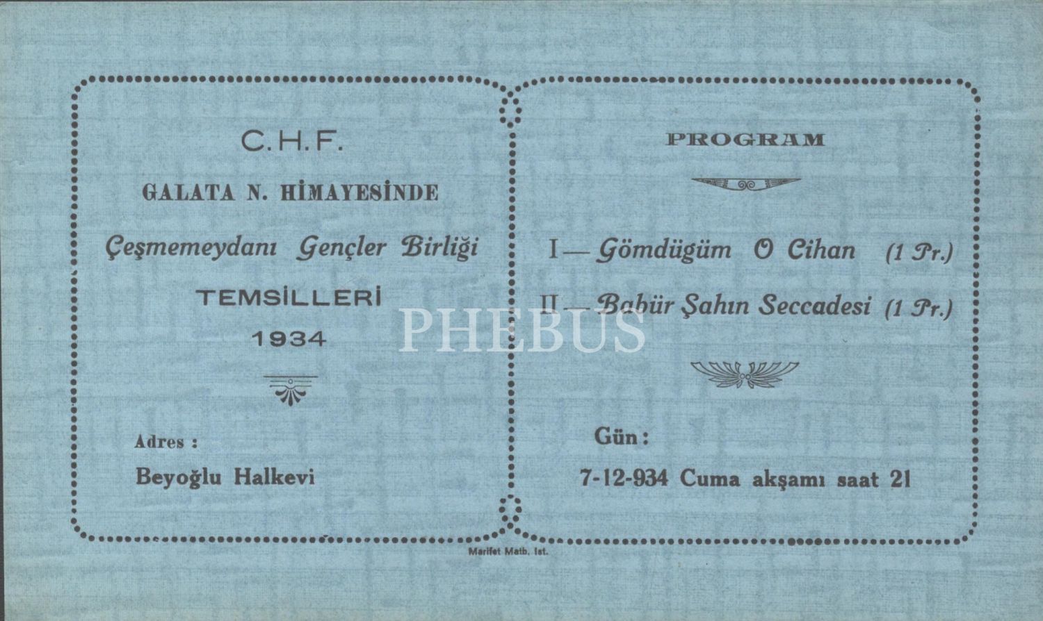 Beyoğlu Halkevi´nde Cumhuriyet Halk Fırkası himayesinde düzenlenen, Çeşmemeydanı Gençler Birliği Temsilleri bileti, 1934, 17x10 cm...
