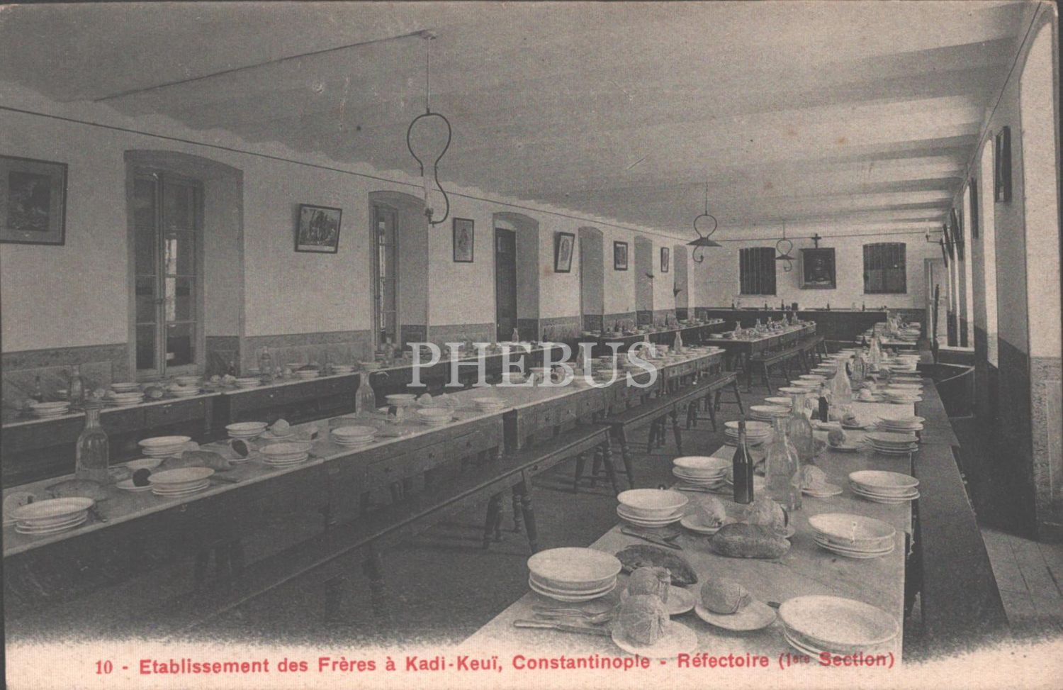Saint-Joseph Fransız Lisesi (Kadıköy) yemekhanesi, Etablissement des Freres a Kadi-Keui, Constantinople - Refectoire (1ate Section), ed. A. Breger Freres (Rue Thenard, Paris), 14x9 cm...