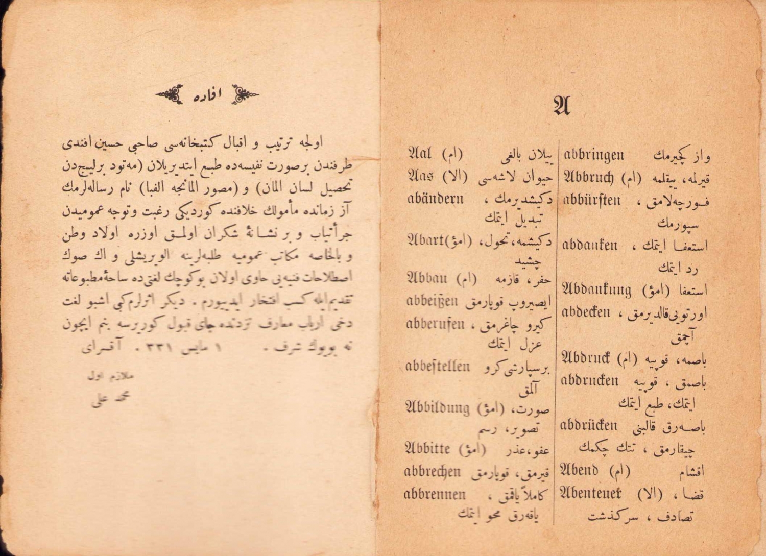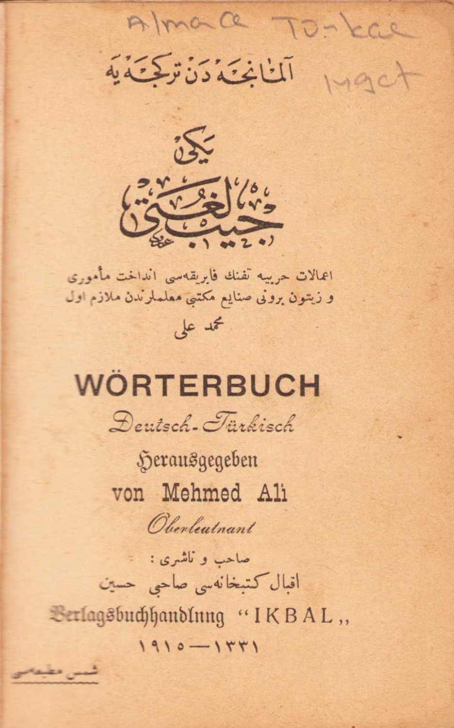 Almanca'dan Türkçeye Yeni Cep Lugatı, Mehmed Ali, İkbal Matbaası, 1331, 412 sayfa, 9x13 cm