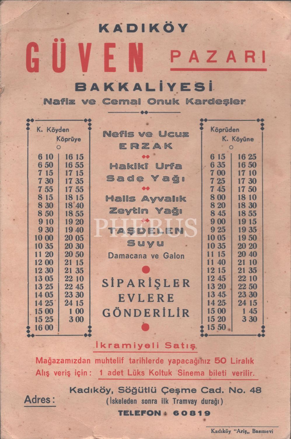 Kadıköy Güven Pazarı Bakkaliyesi (Nafiz ve Cemal Onuk Kardeşler) reklam kartoneti, vapur tarifeli, Kadıköy Ariş Basımevi, 16x24 cm...