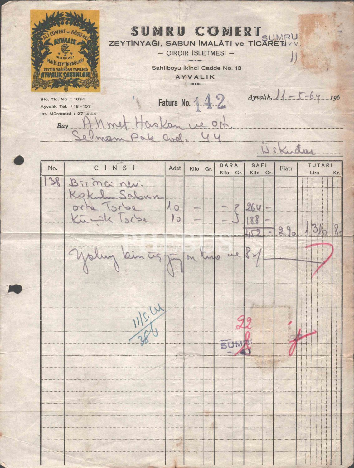 Sumru Cömert (Zeytinyağı, Sabun İmalâtı ve Ticareti -Çırçır İşletmesi-), Ayvalık antetli, 11 Mayıs 1964 tarihli fatura, 22x29 cm...