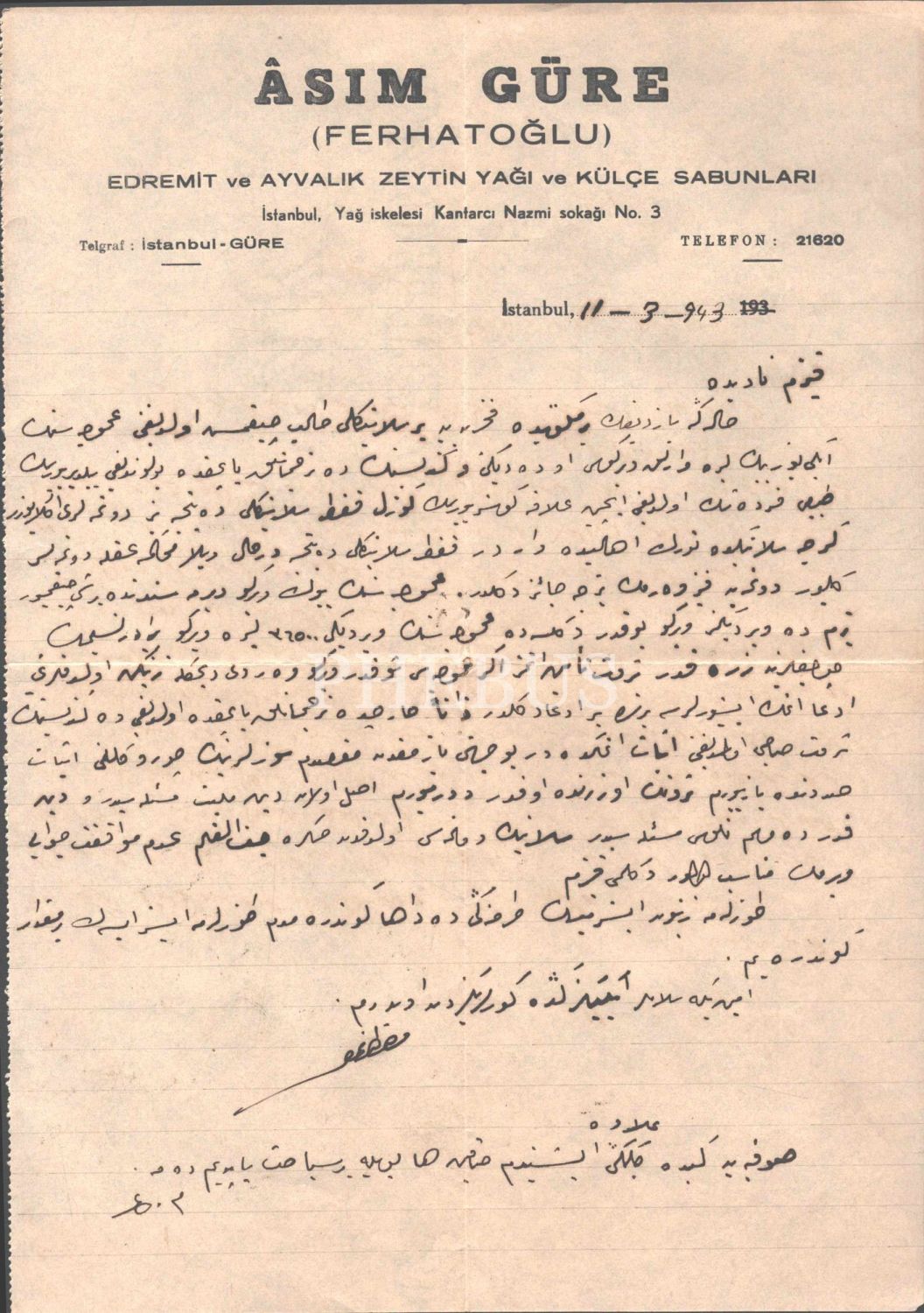 Âsım Güre (Ferhatoğlu) - Edremit ve Ayvalık Zeytin Yağı ve Külçe Sabunları (İstanbul) antetli kâğıda kaleme alınmış şahsi mektup, 20x29 cm...