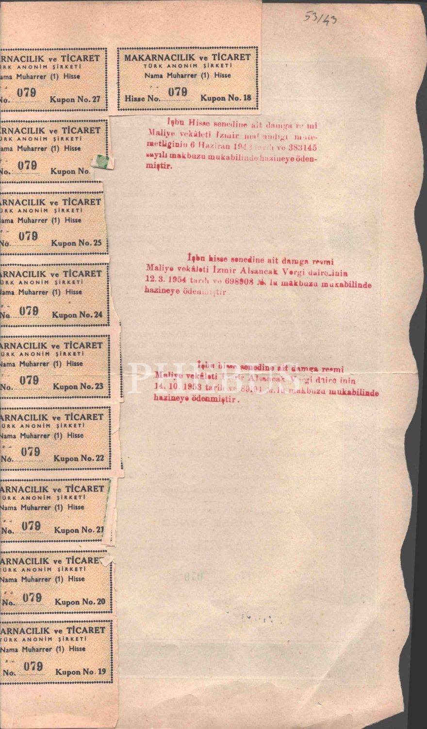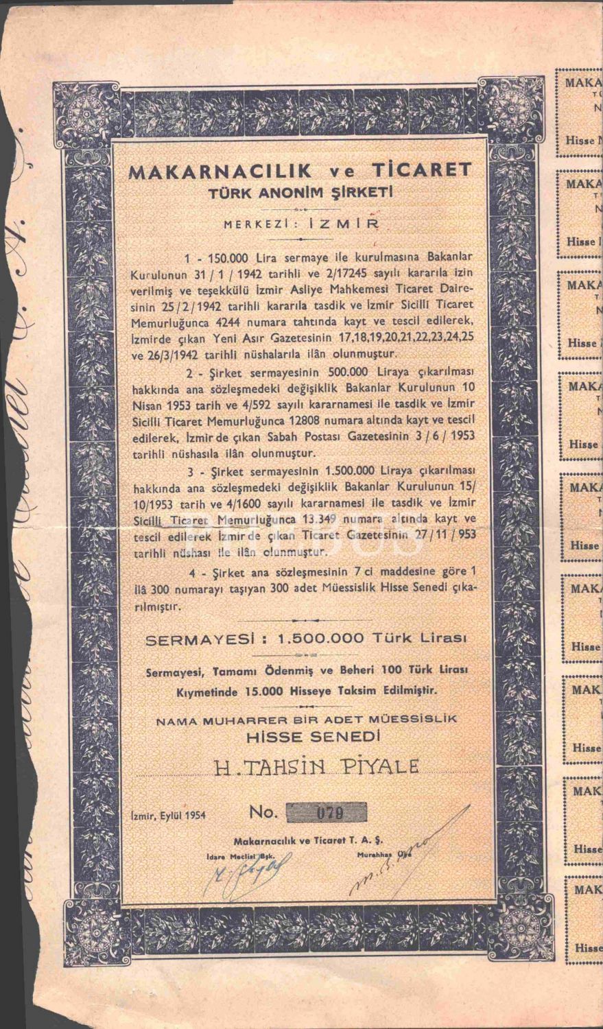 Makarnacılık ve Ticaret Türk Anonim Şirketi (Merkezi: İzmir) hisse senedi, Eylül 1954 tarihli, 32x34 cm...