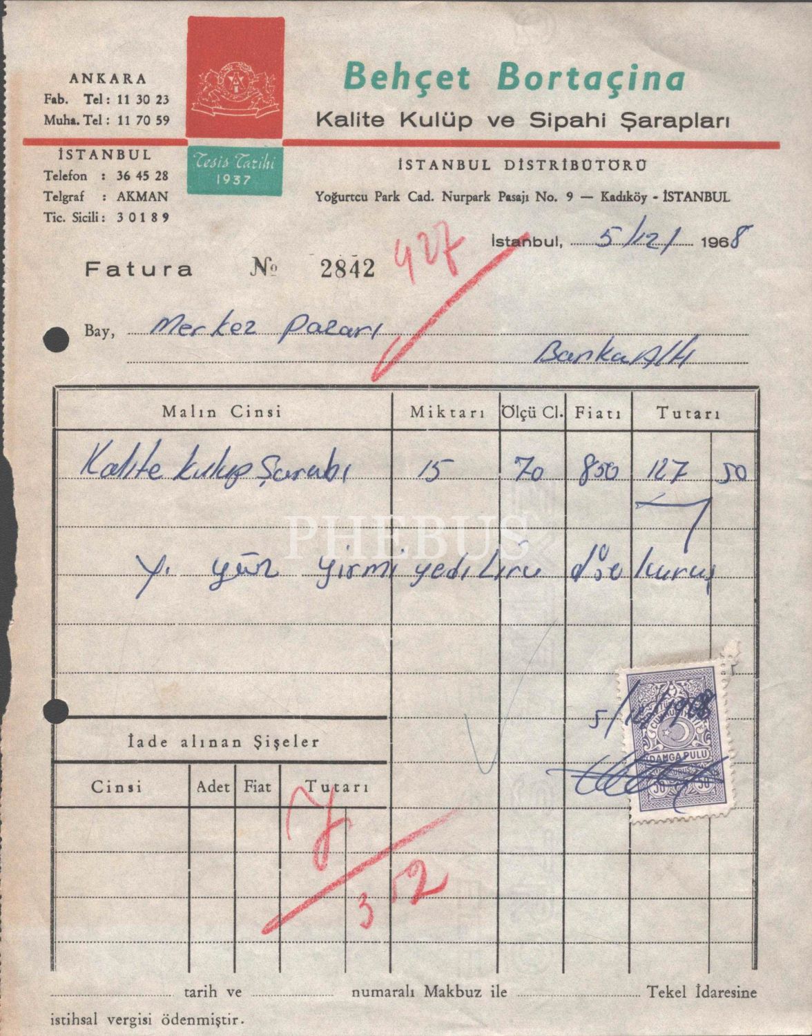 Behçet Bortaçina - Kalite Kulüp ve Sipahi Şarapları (Kadıköy, İstanbul) antetli, 5 Aralık 1968 tarihli fatura, 18x22 cm...