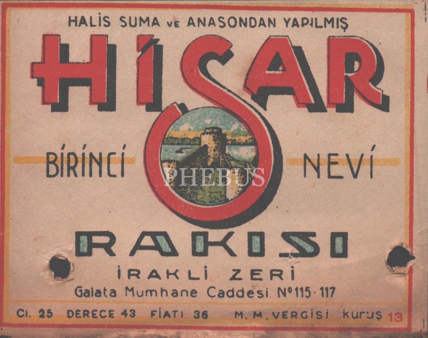 "Halis Suma ve Anasondan Yapılmış" Hisar -Birinci Nevi- Rakısı, Iraklı Zeri (Galata Mumhane Caddesi), 10x8 cm...