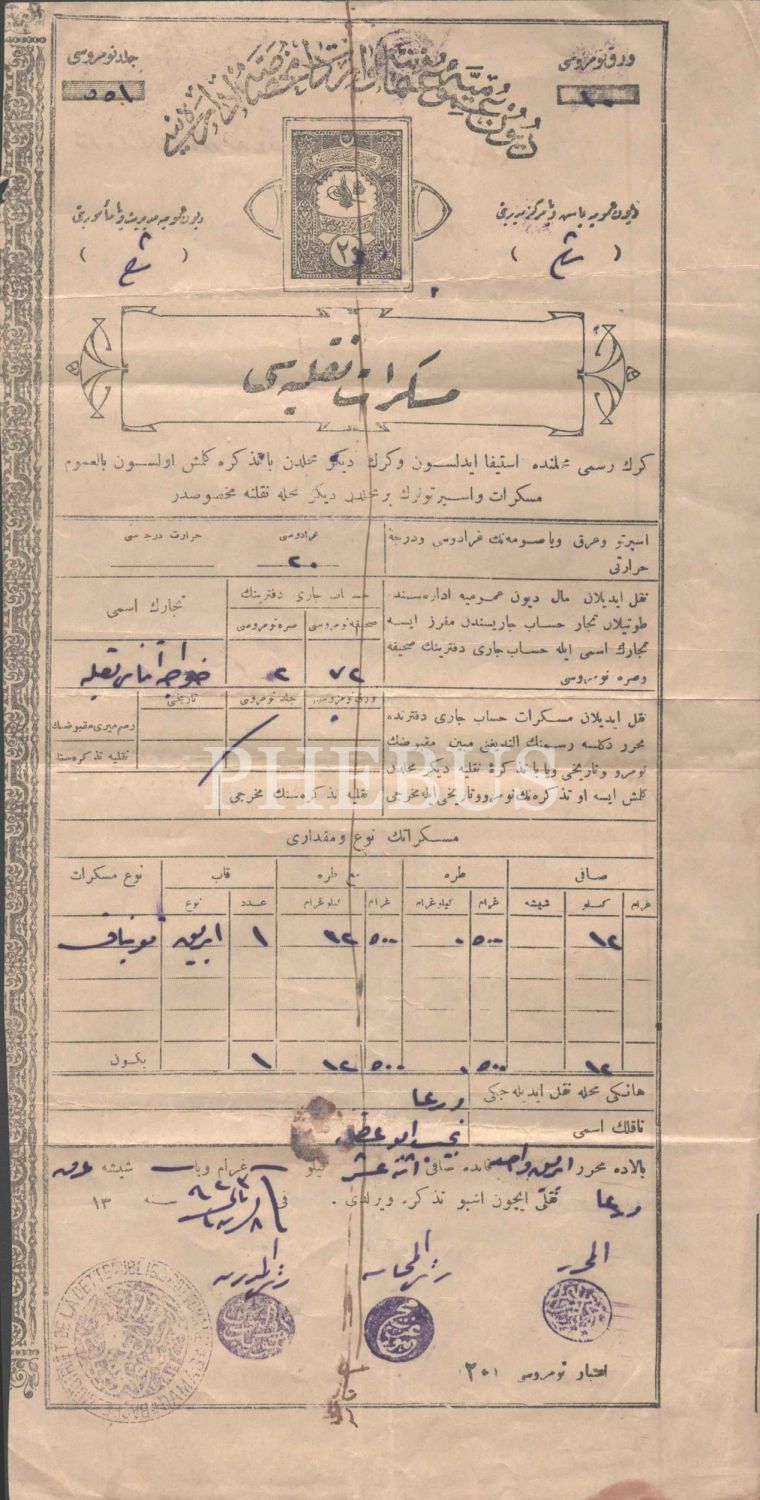 Düyun-u Umumiyye ... İdaresi antetli, 8 Teşrinisani 1326 tarihli müskirat nakliyesi belgesi, 16x32 cm...