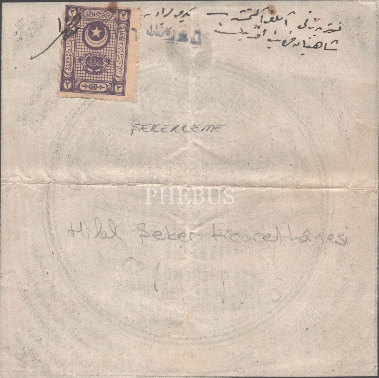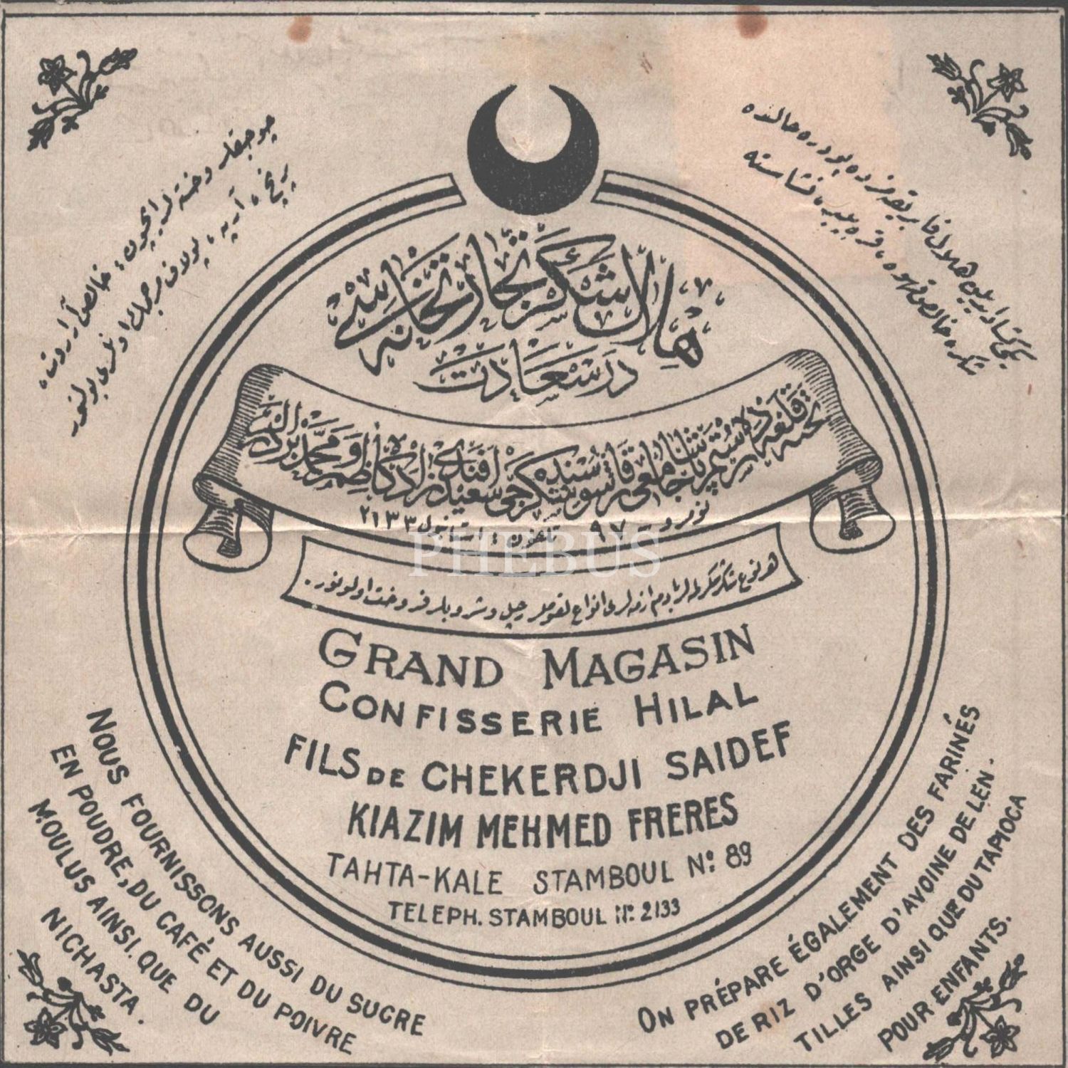Osmanlıca ve Fransızca "Hilal Şeker Ticarethanesi (Şekerci Said Efendi´nin Biraderi Kâzım ve Mehmet Biraderler), Tahtakale, İstanbul" yazılı etiket 13x13 cm...