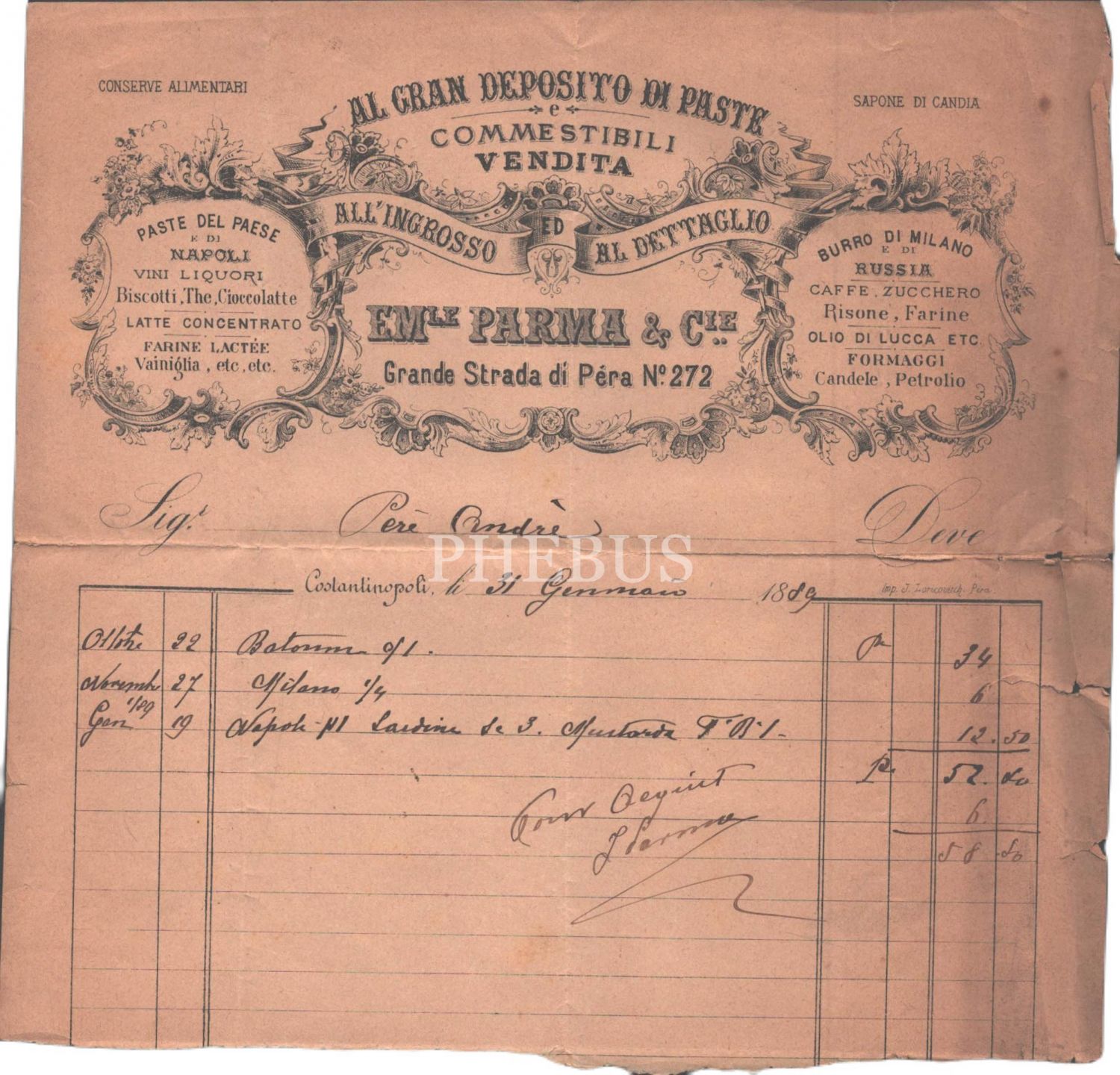 İstiklal Caddesi´nde yer alan bir İtalyan lokantasına ait 1889 tarihli fatura, Grande Strada di Pera, Constantinopoli, 23x22 cm...