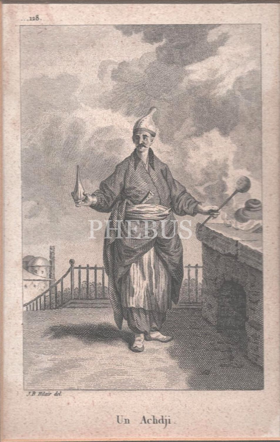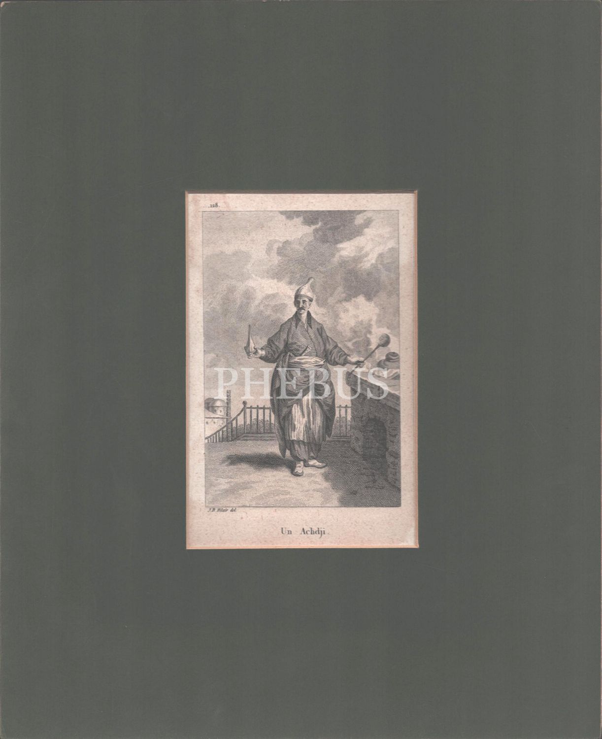 Osmanlı dönemi aşçı gravürü, "Un Achdji", J. B. Hilair, 10x16 cm, paspartusuyla birlikte 27x33 cm...