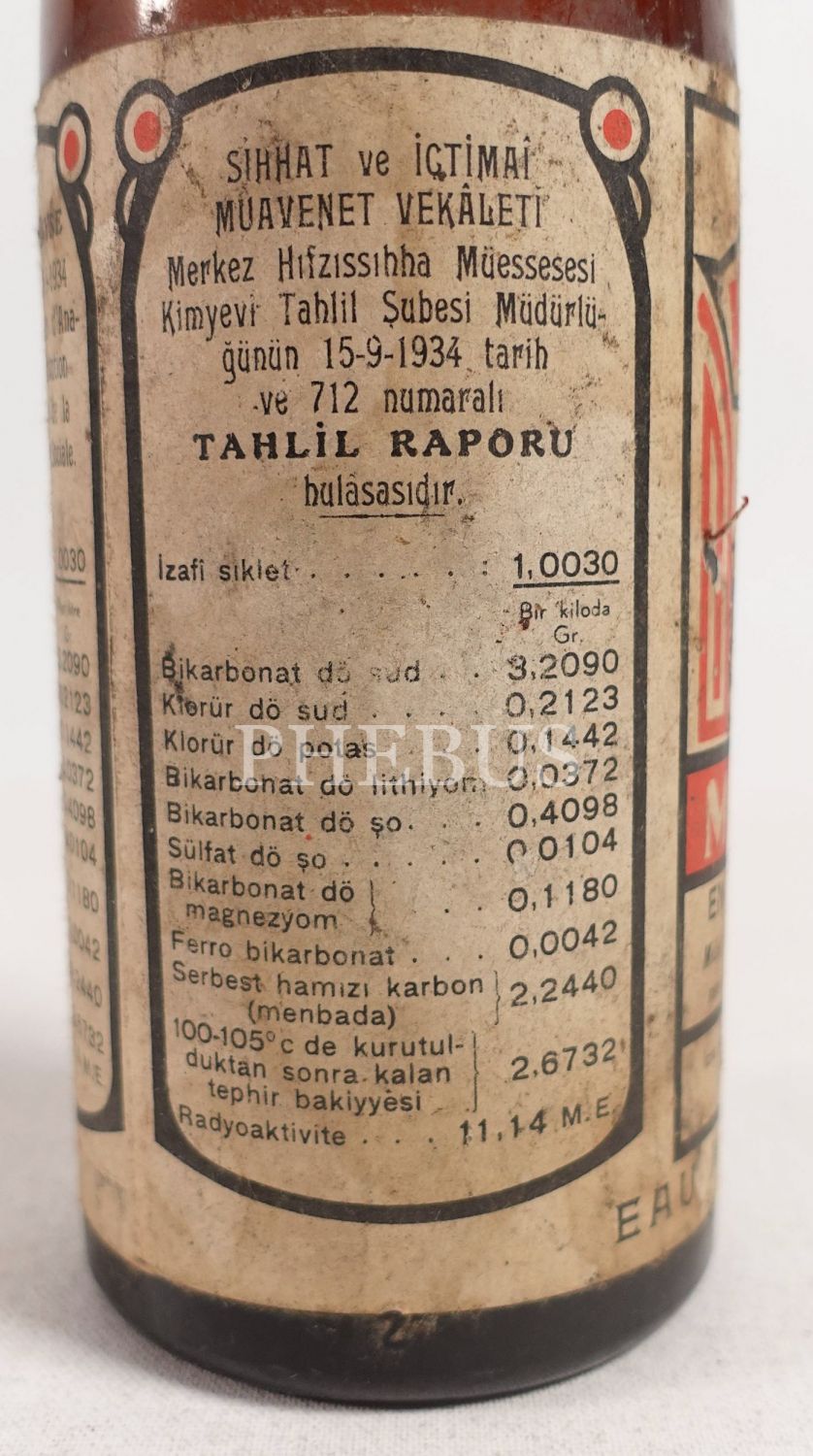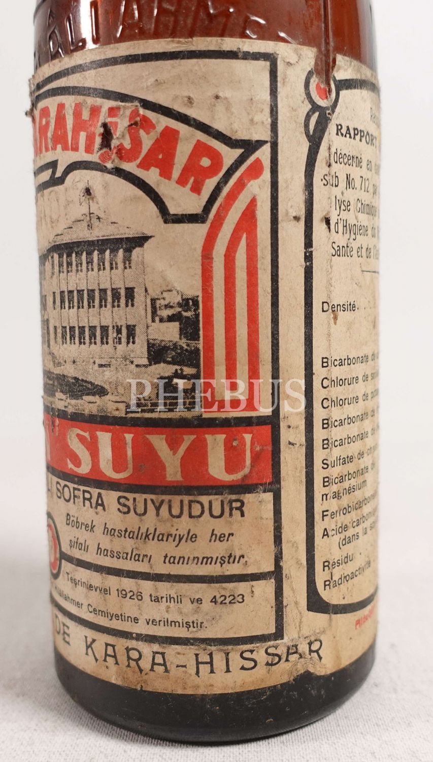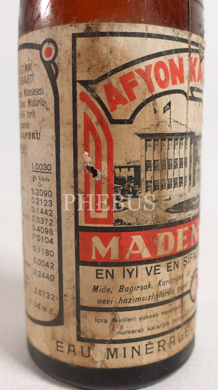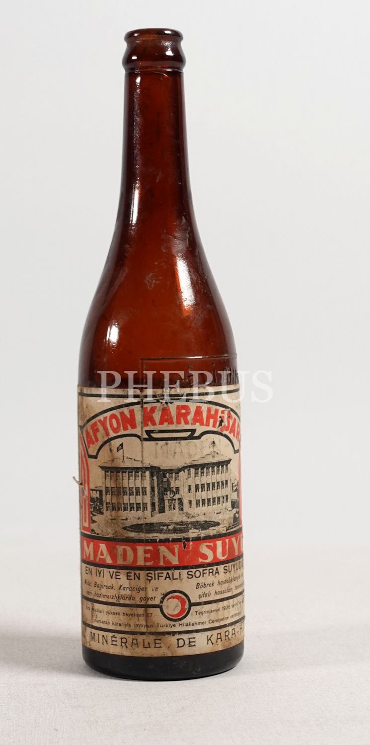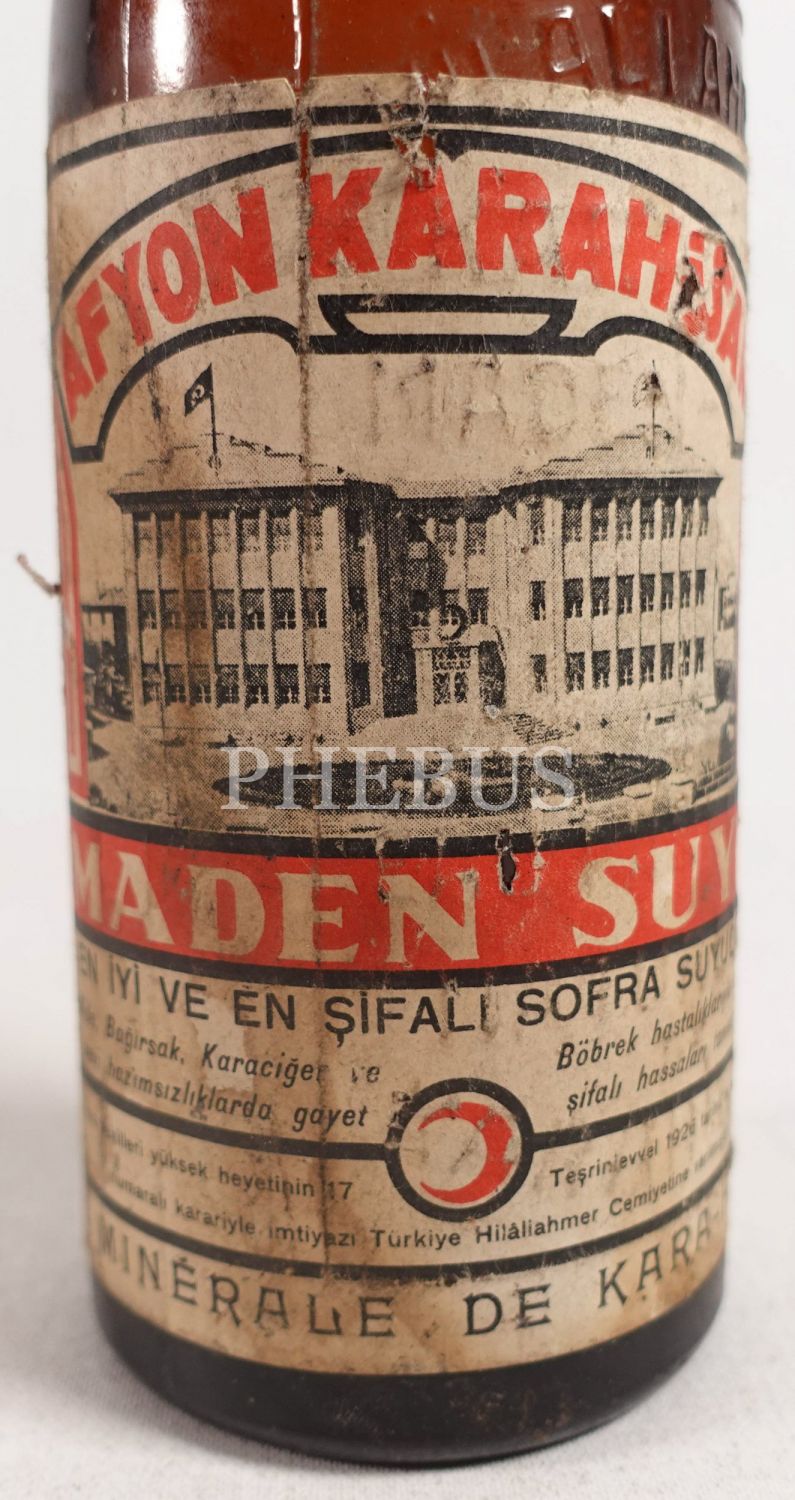 Hilâli Ahmer kabartma yazılı, Türkçe-Fransızca etiketli Afyon Karahisar Maden Suyu şişesi, 1934 ruhsatlı, 28x7 cm...