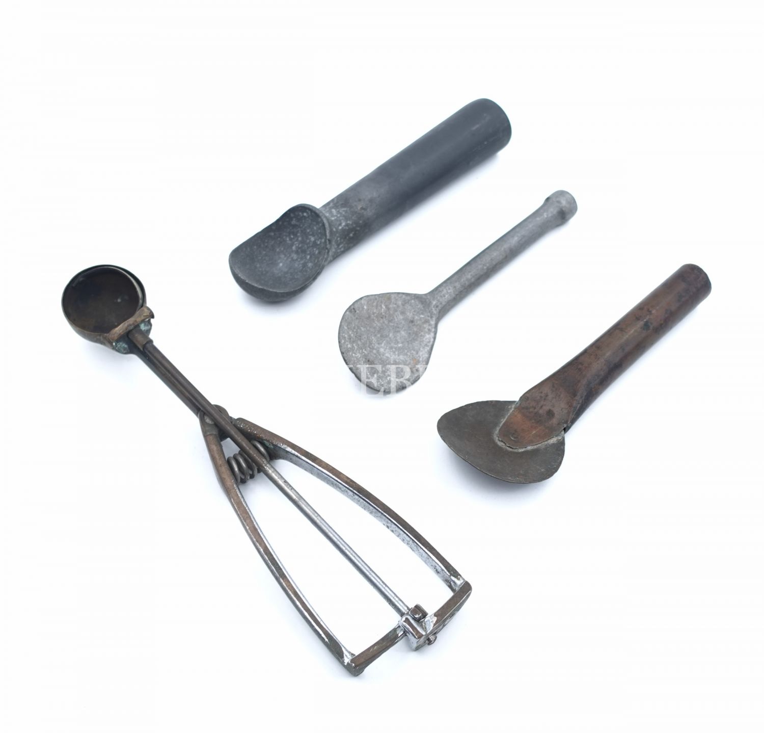 4 adet dondurma kaşığı, biri "Tunç İş", biri de "Made in Germany" damgalıdır, muhtelif ebatlarda...