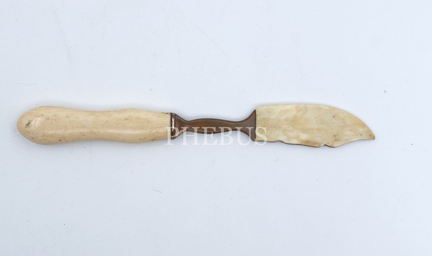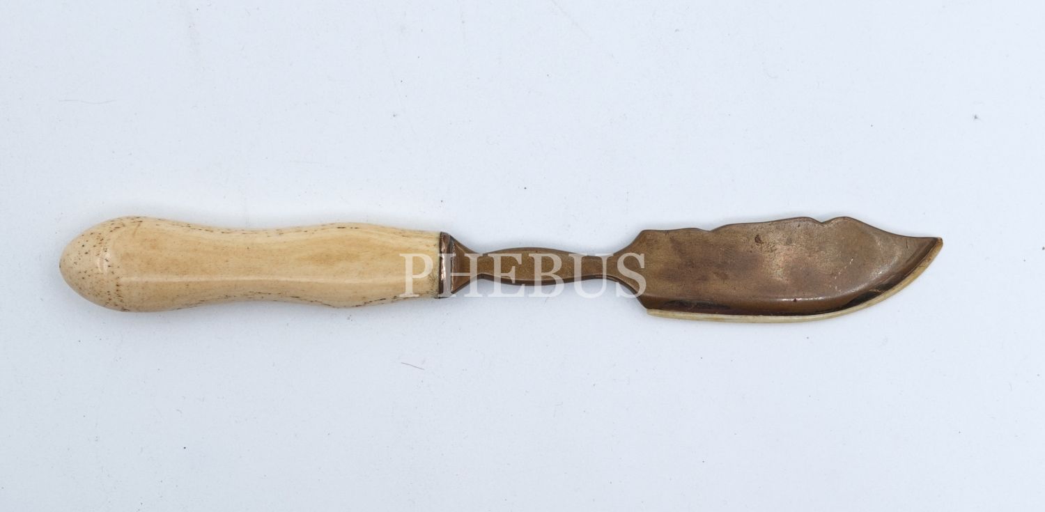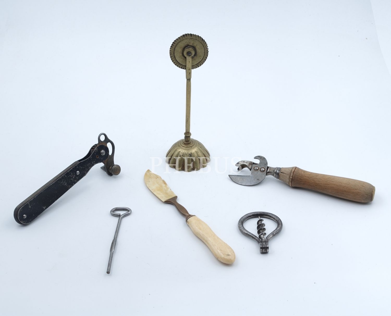Lot içerisinde bir adet pirinç hamur kesme aleti, bir adet kemik saplı pirinç tereyağı bıçağı, dört adet de metal şişe ve konserve açacağı mevcuttur.