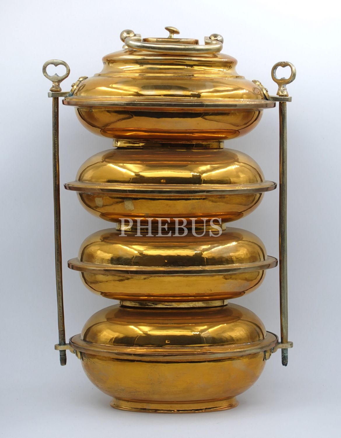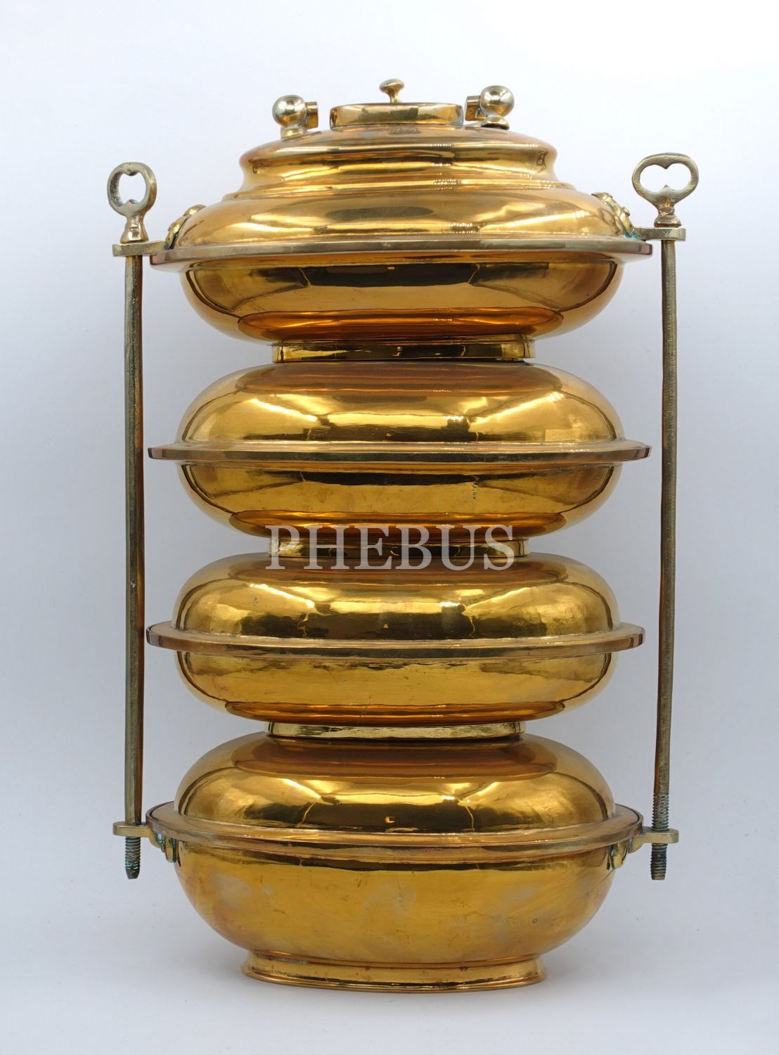 Süleymaniye işi sefer tası, kalaylı, dört katlı, en üst katında baharatlık mevcut, 38x22 cm, ağırlık 2809 g...