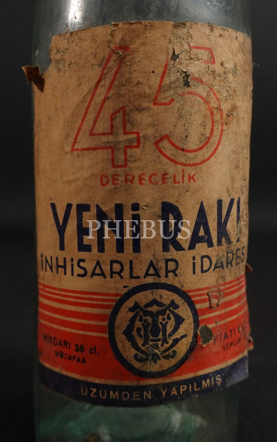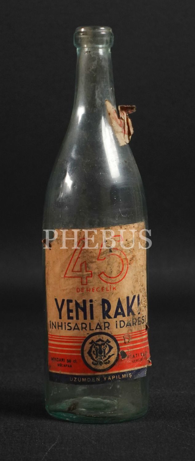 İnhisar kabartma yazılı "45 Derecelik" Yeni Rakı şişesi (50 cl.), İnhisarlar İdaresi, 1934 üretimi, 26x7 cm...