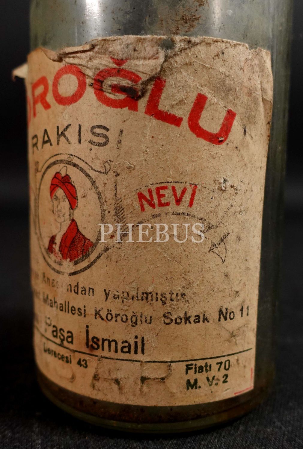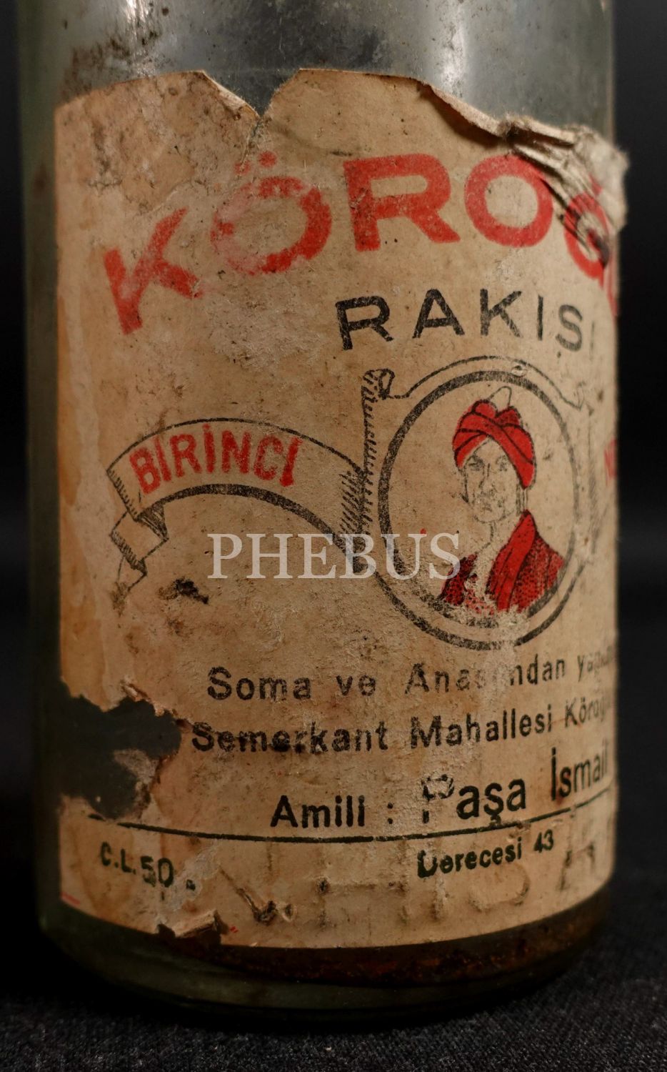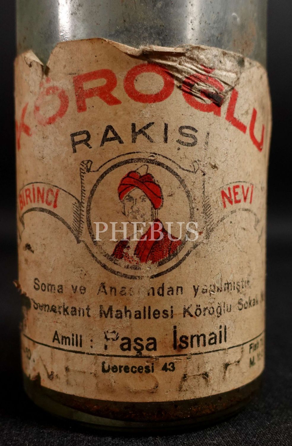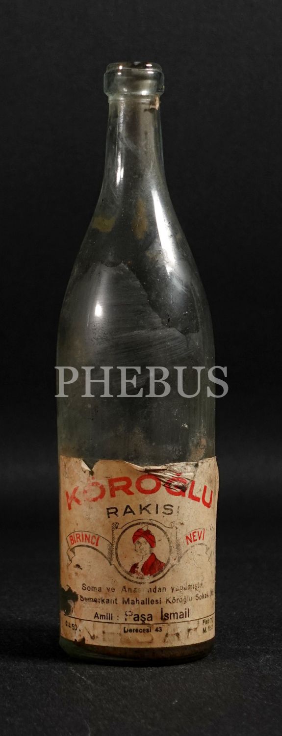 "Birinci Nevi" Köroğlu Rakısı şişesi (50 cl.), amili: Paşa İsmail, 1934 öncesi üretim, 26x7 cm...