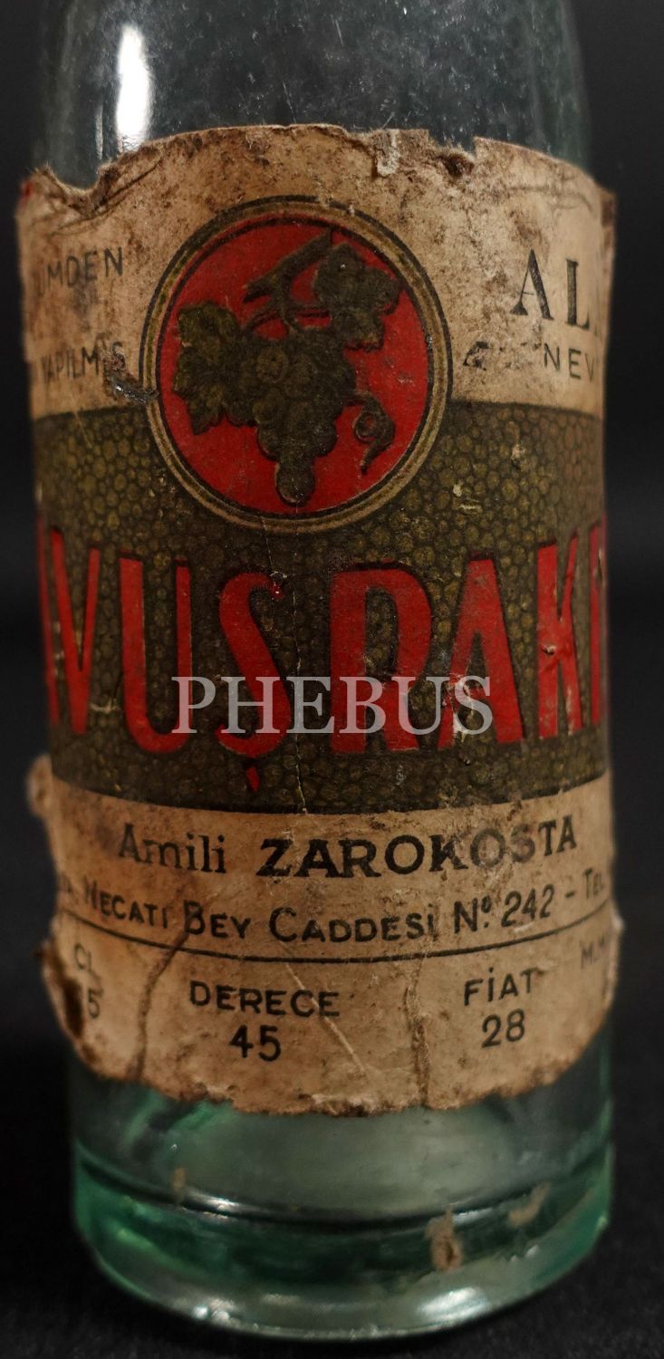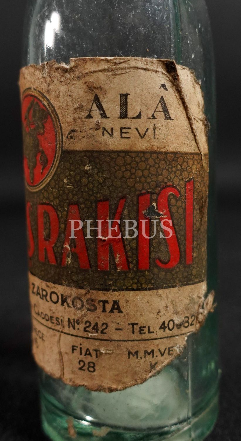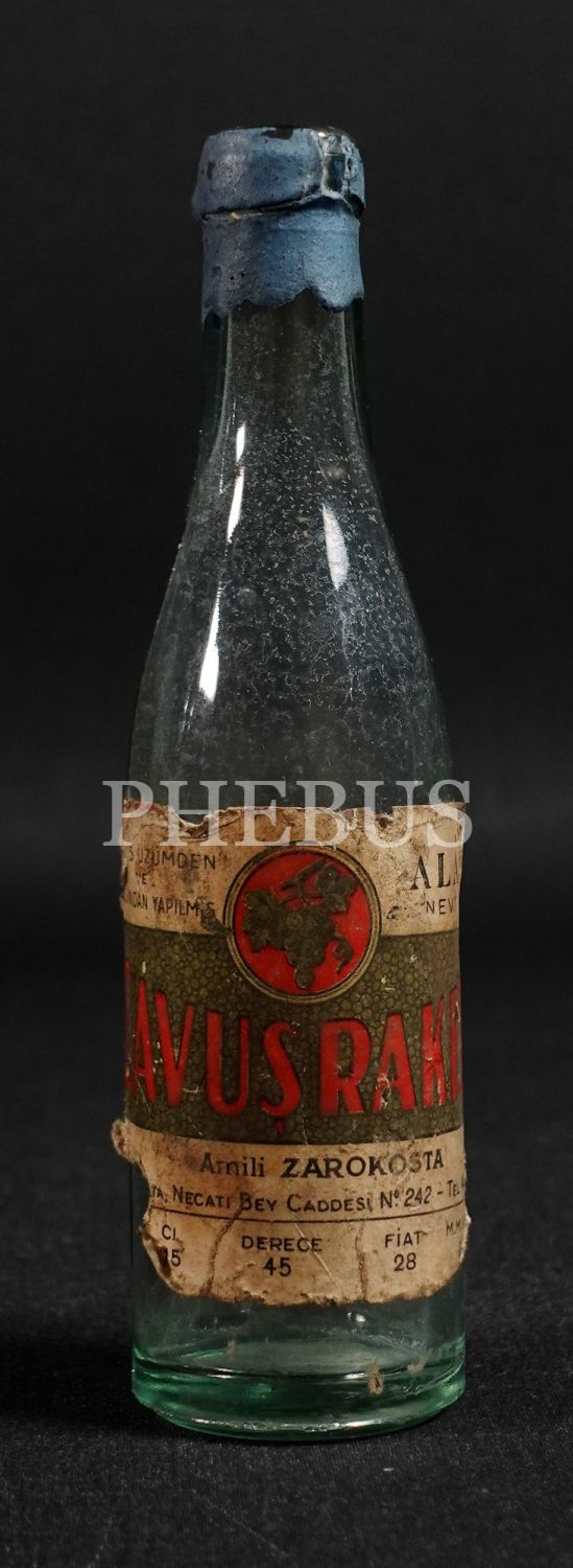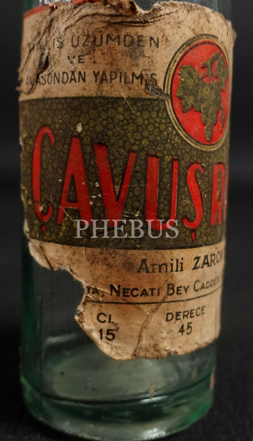 İnhisar kabartma yazılı "Halis Üzümden ve Anasondan Yapılmış Alâ Nevi" Çavuş Rakısı şişesi (15 cl.), amili: Zarokosta, 1934 öncesi üretim, 19x5 cm...