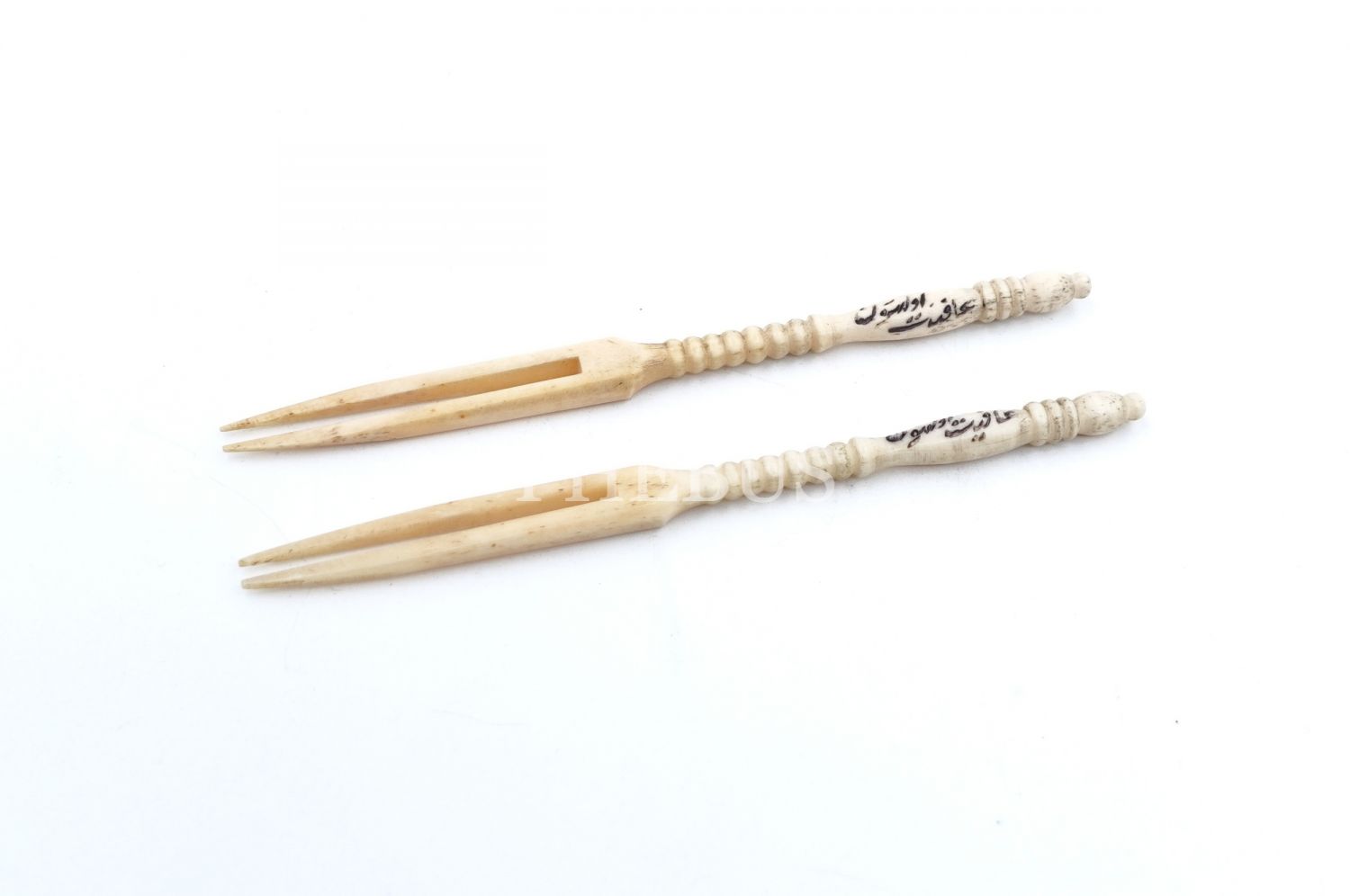 Gövdesi Osmanlıca "Afiyet Olsun" yazılı bir çift kemik çatal, 12x1 cm...
