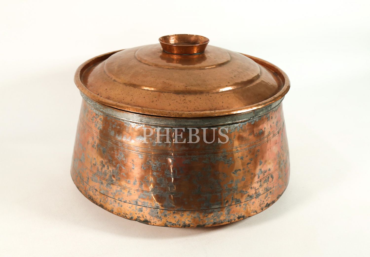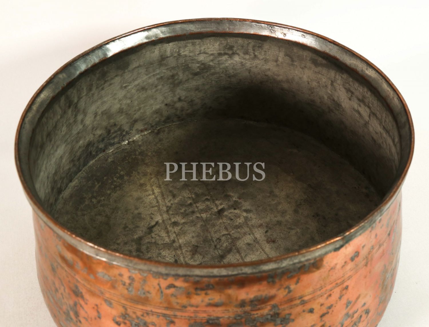 Gövde çeperi üzeri Osmanlıca "Kebut kazasına tabi tavuk tası, Süleyman Ağa, 1213" yazılı büyük boy bakır kazan, 47x27x50 cm...
