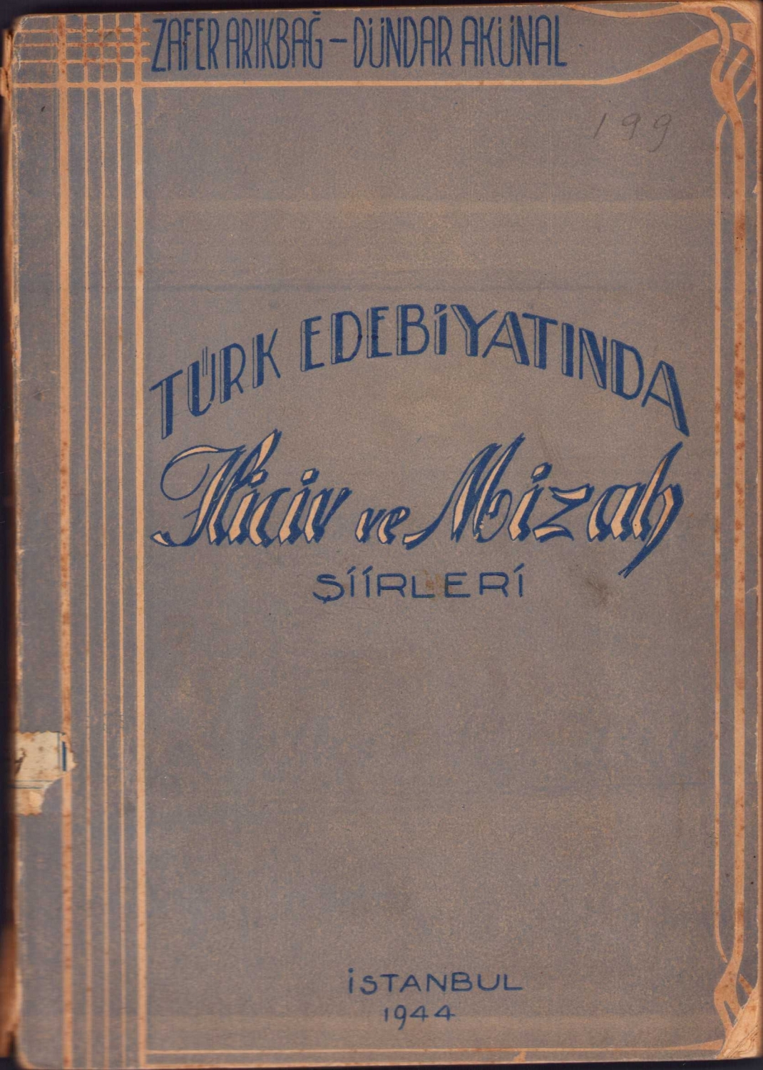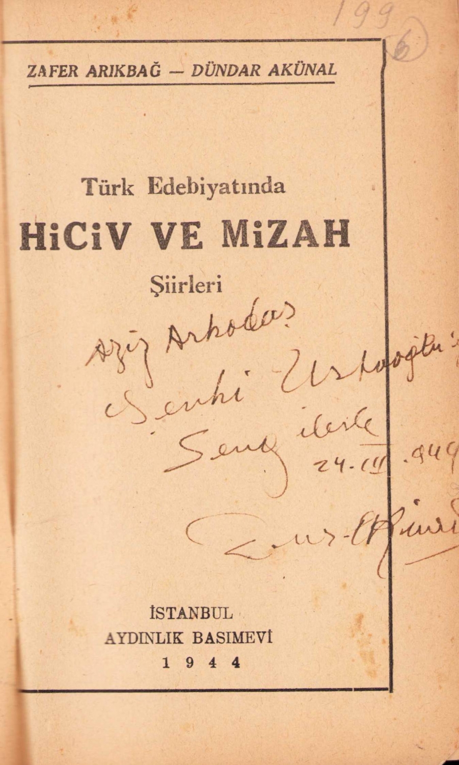 Türk Edebiyatında Hiciv ve Mizah Şiirleri, Zafer Arıkbağ - Dündar İstanbul, 1944, imza okunamadı, 109 sayfa, 14x20 cm