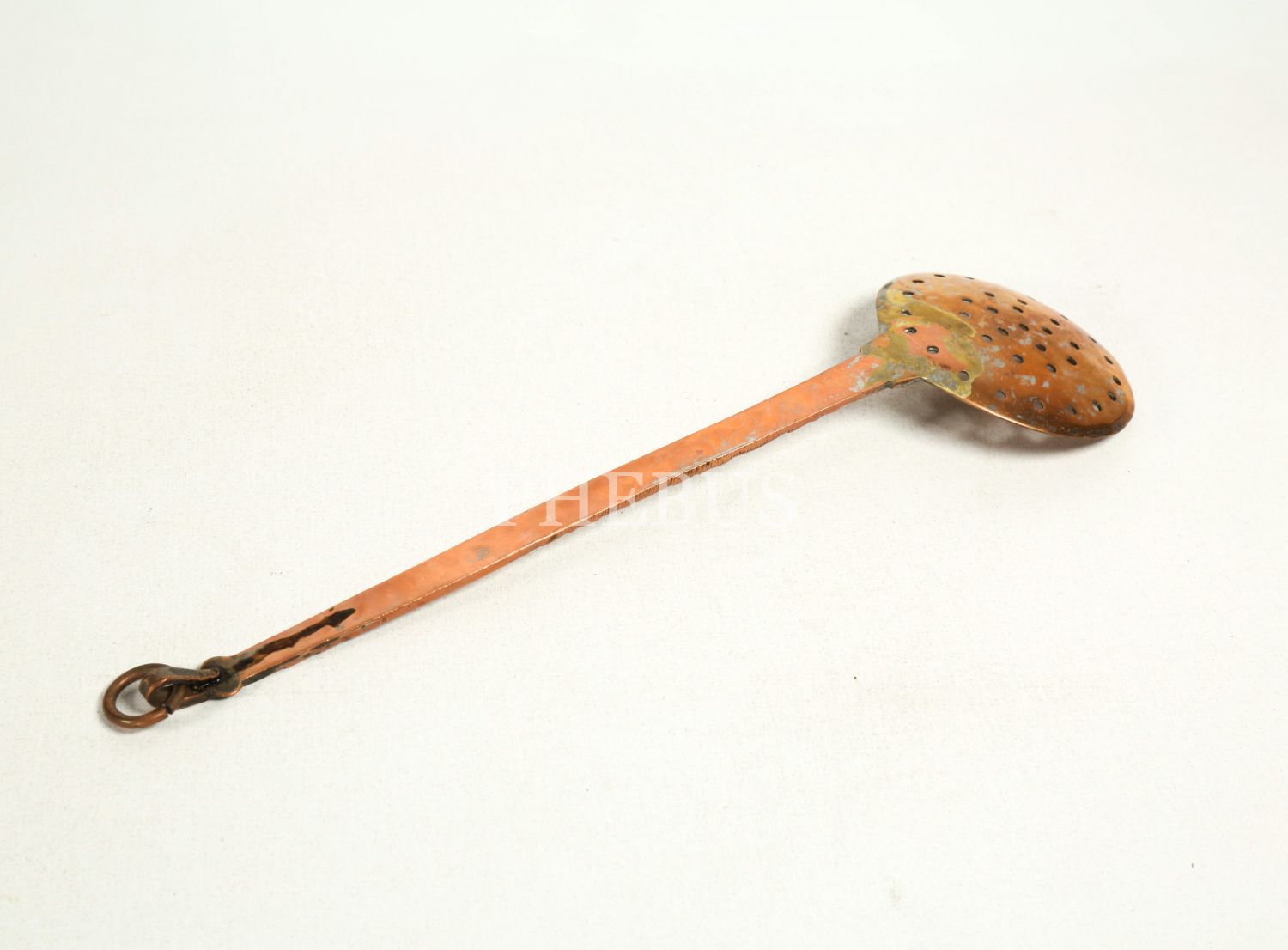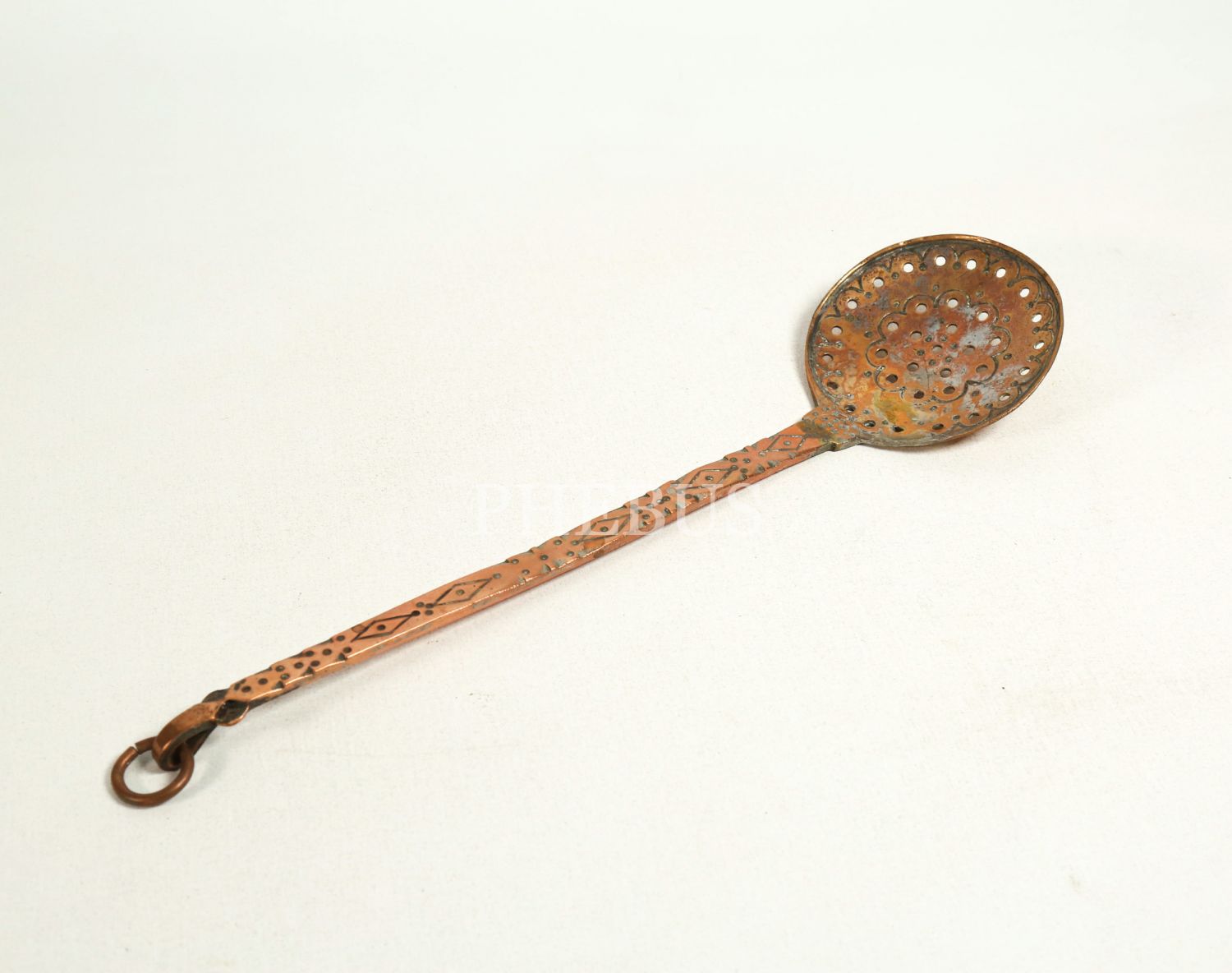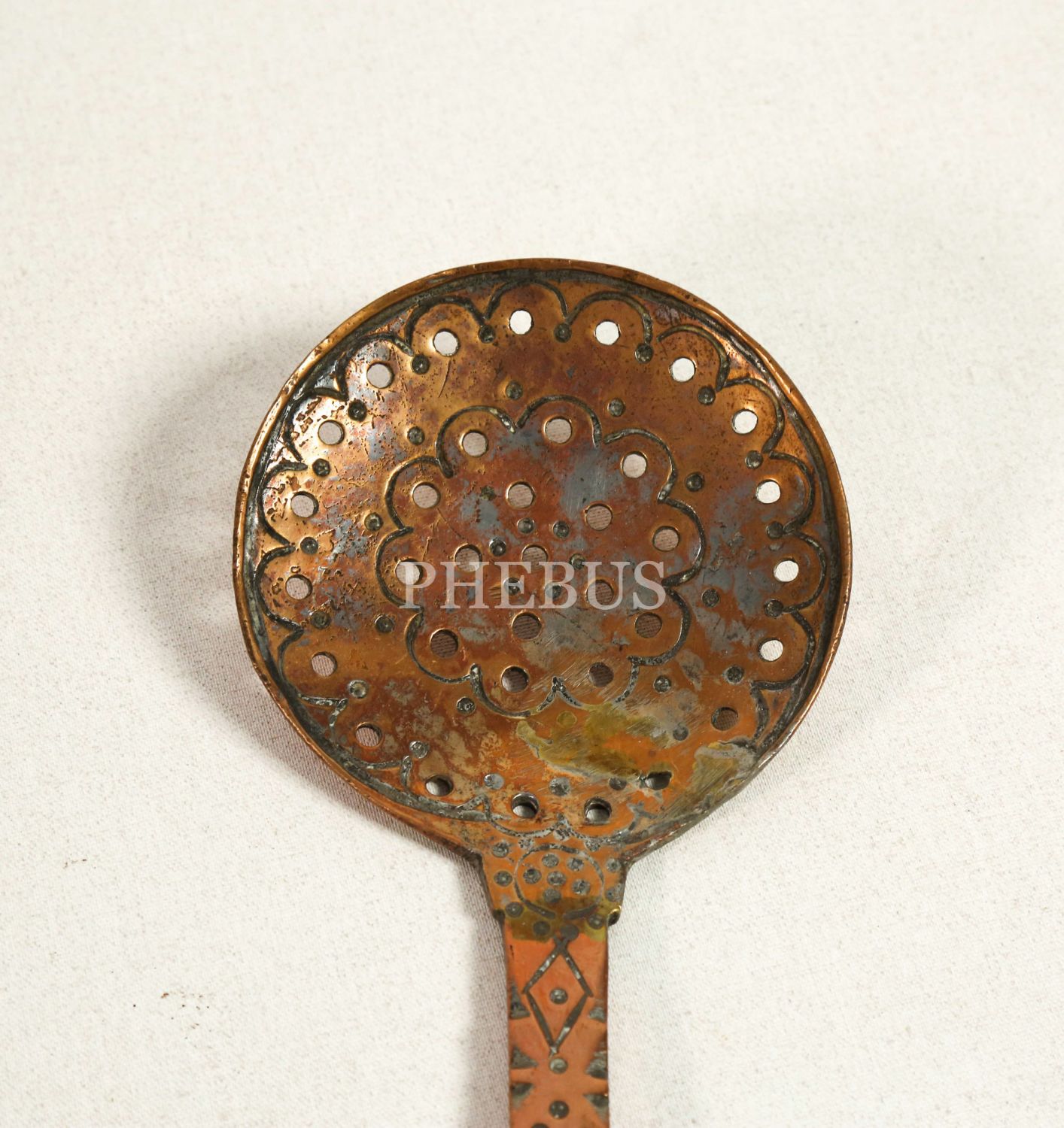 Osmanlı döneminden tutamak kısmı geometrik desenli bakır kevgir, 44x12 cm...