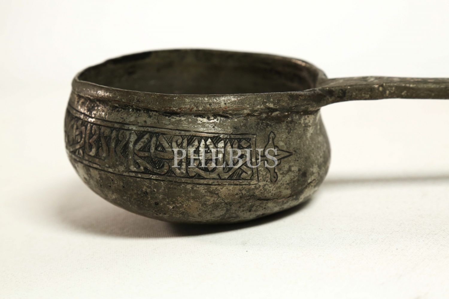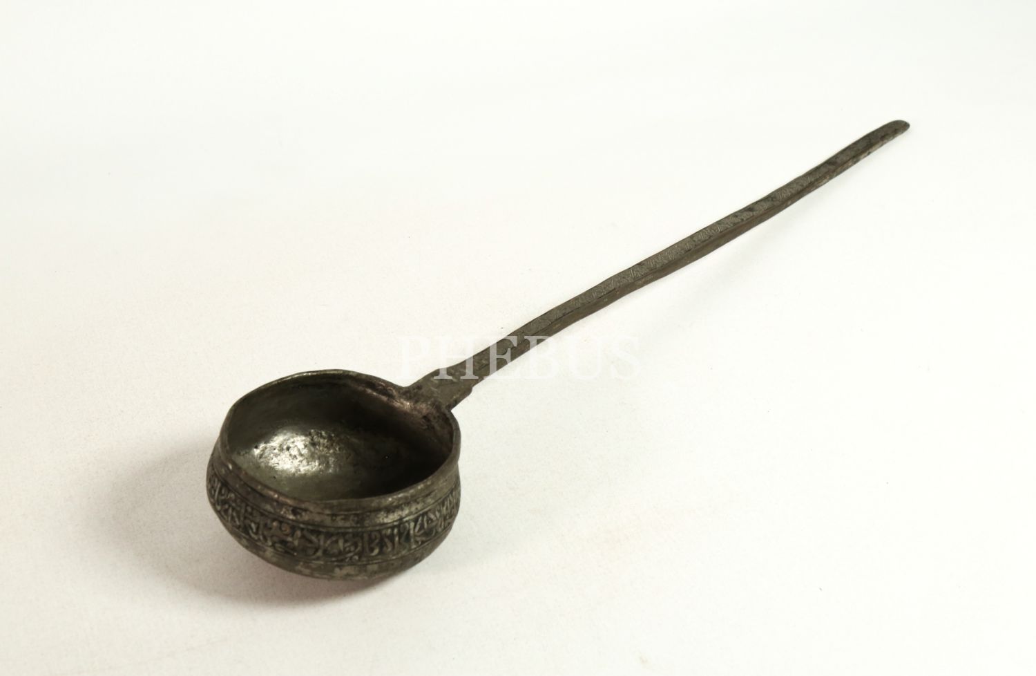 Osmanlı döneminden tutamak kısmı kalem işçilikli, baş çeperi Osmanlıca yazılı demir döküm kepçe, 64x12 cm, ağırlık: 36 g...