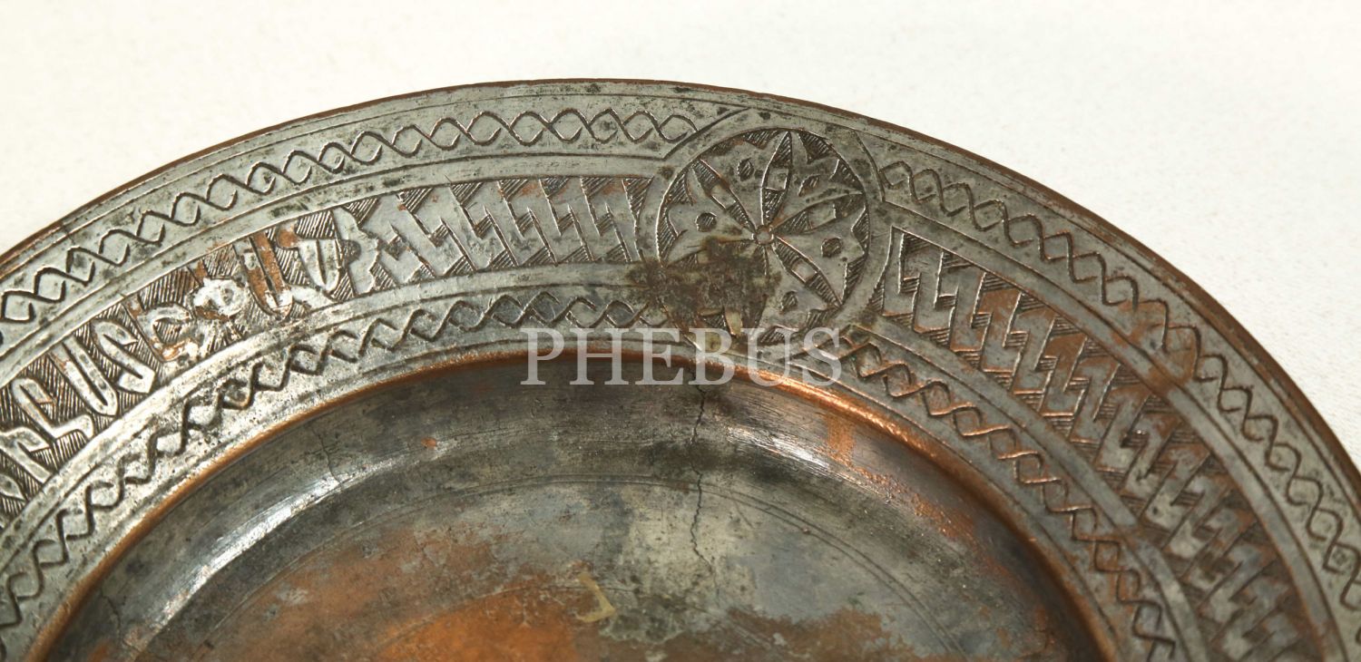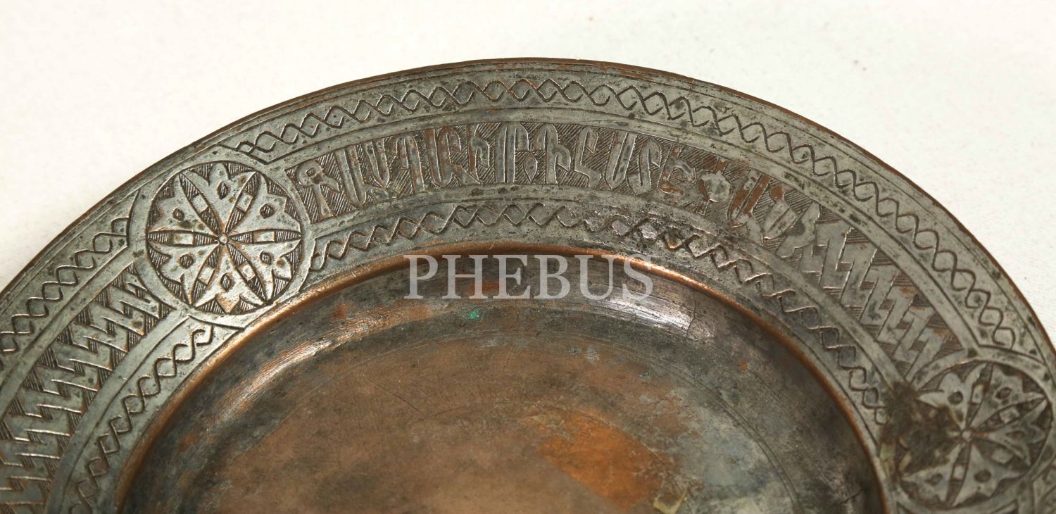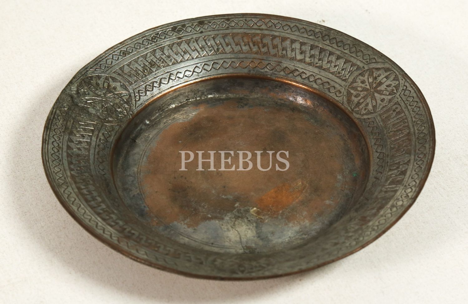 Osmanlı döneminden çeperleri kalem işçilikli ve Ermenice "Kasbar oğlu Istefan" yazılı bakır tabak, çap 21 cm...