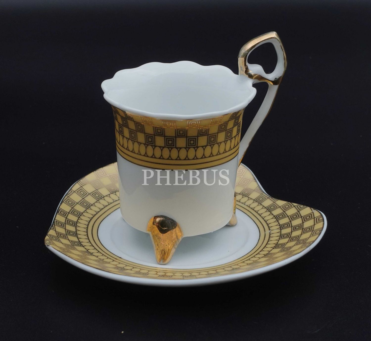 Altın yaldız geometrik şekiller ile süslenmiştir, fincanın taban kısmında 3 adet ayak mevcuttur ve tabak kalp şeklindedir...