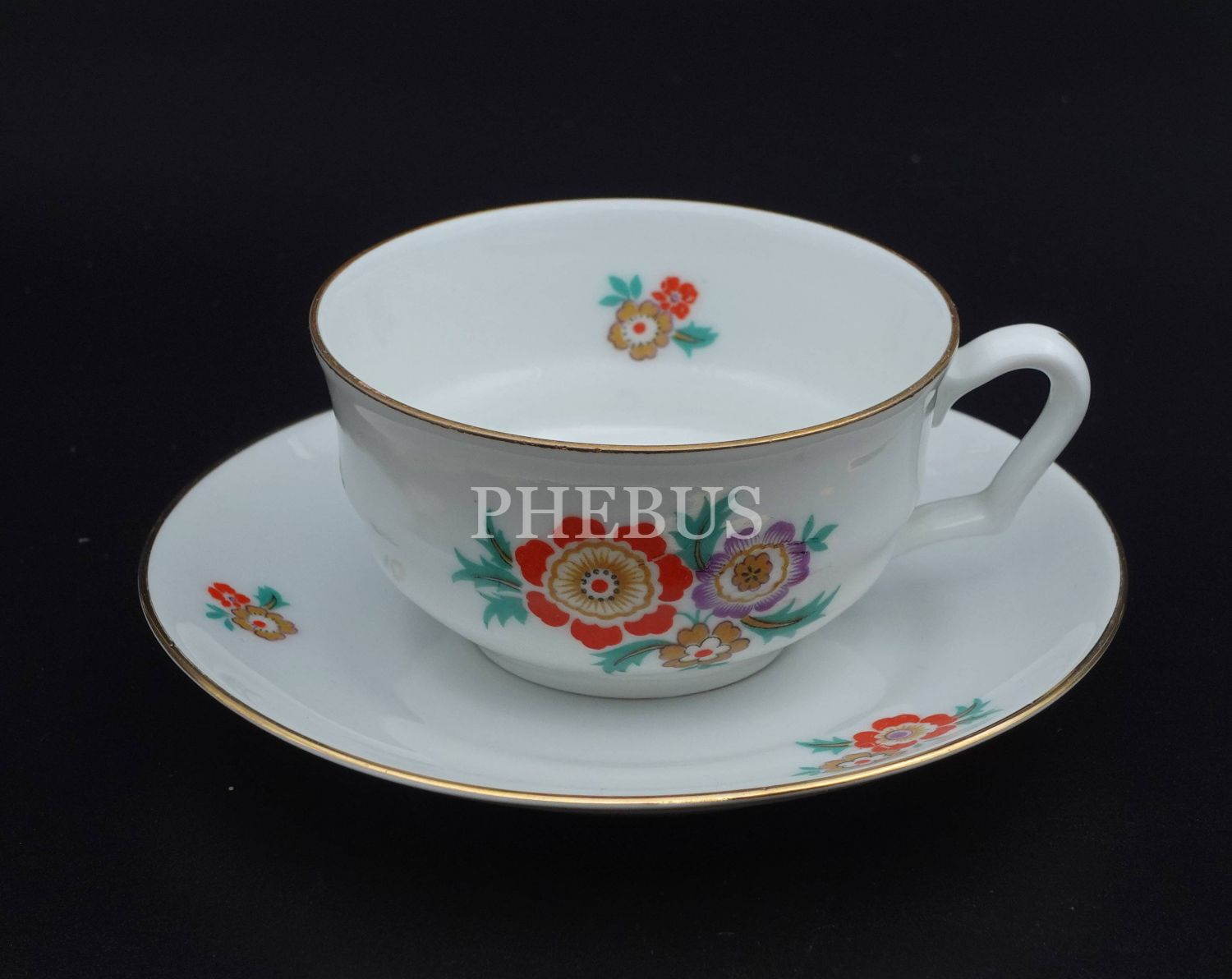 Fincan ve tabağın üzeri floral desenler ile süslenmiştir