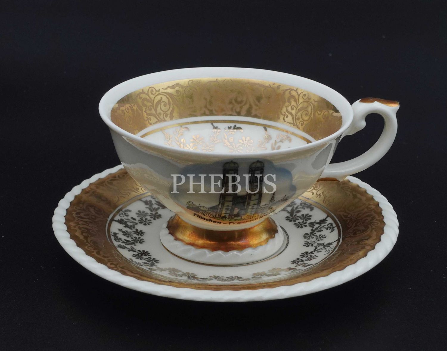 Fincan ve tabağın yüzeyinde altın yaldız şerit ve floral desenler mevcut olup fincanın dış yüzeyi ise ´´Münhen - Frauenkirche´´ çizimi ile süslenmiştir