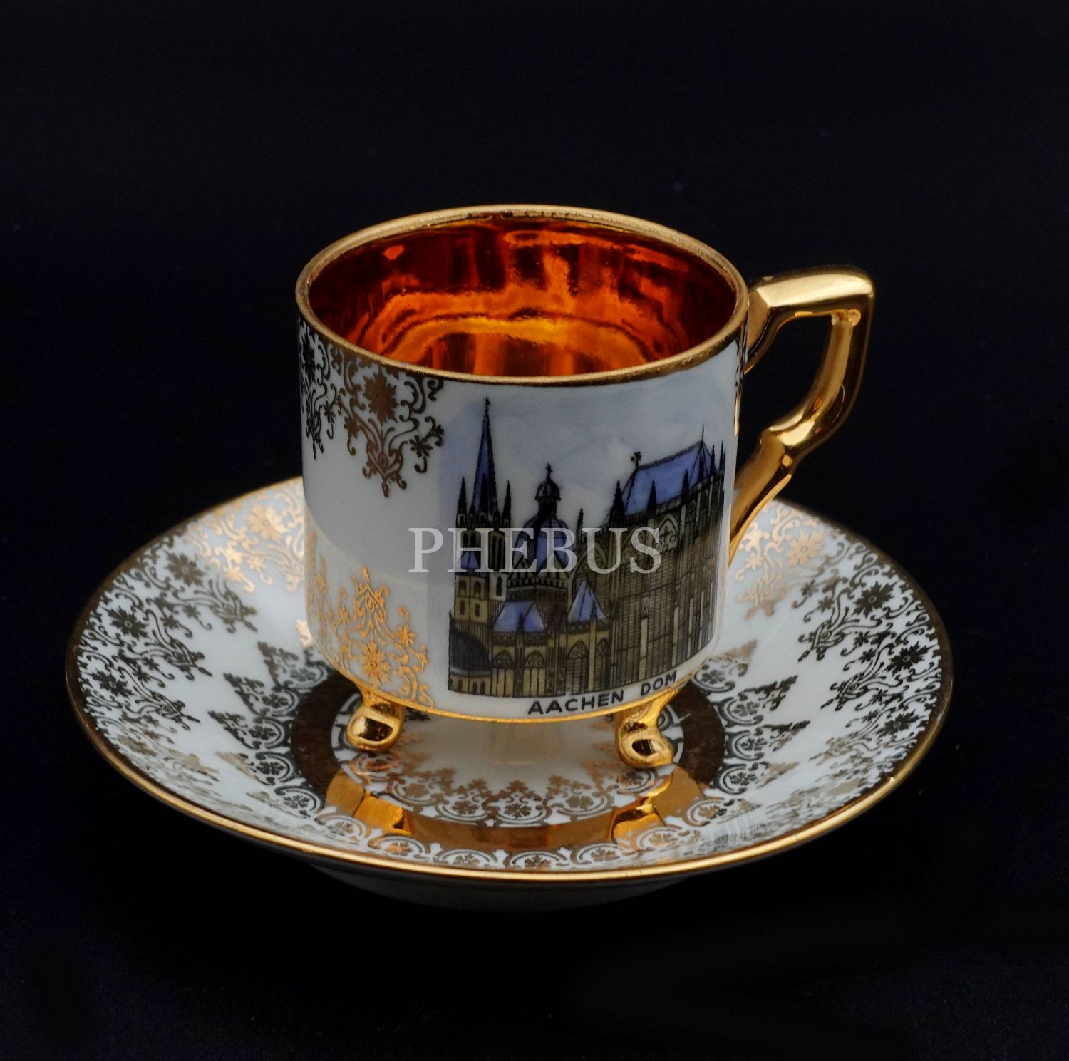 Fincan ve tabağının yüzeği altın yaldız oryantal desenler ile bezenmiş ve fincanın dış yüzeyi ´´Aachen Dom´´ çizimi ile süslenmiştir...