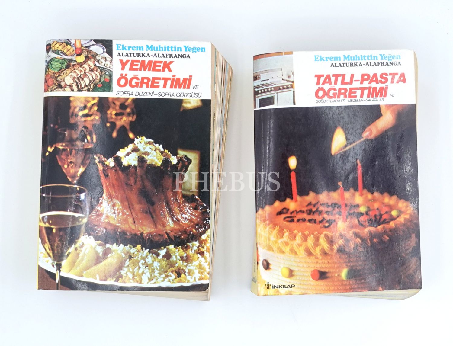 Alaturka-Alafranga YEMEK ÖĞRETİMİ VE SOFRA SOFRA DÜZENİ-GÖRGÜSÜ / TATLI-PASTA ÖĞRETİMİ VE SOĞUK YEMEKLER-MEZELER-SALATALAR 1-2, Ekrem Muhittin Yeğen, İnkılâp Kitabevi, İstanbul, 783+767 sayfa, 17x24 cm...