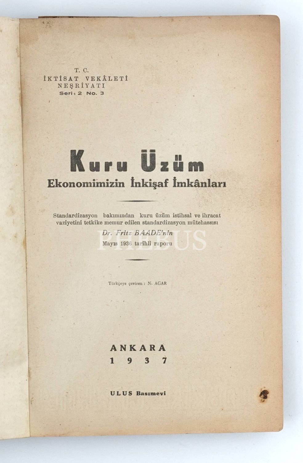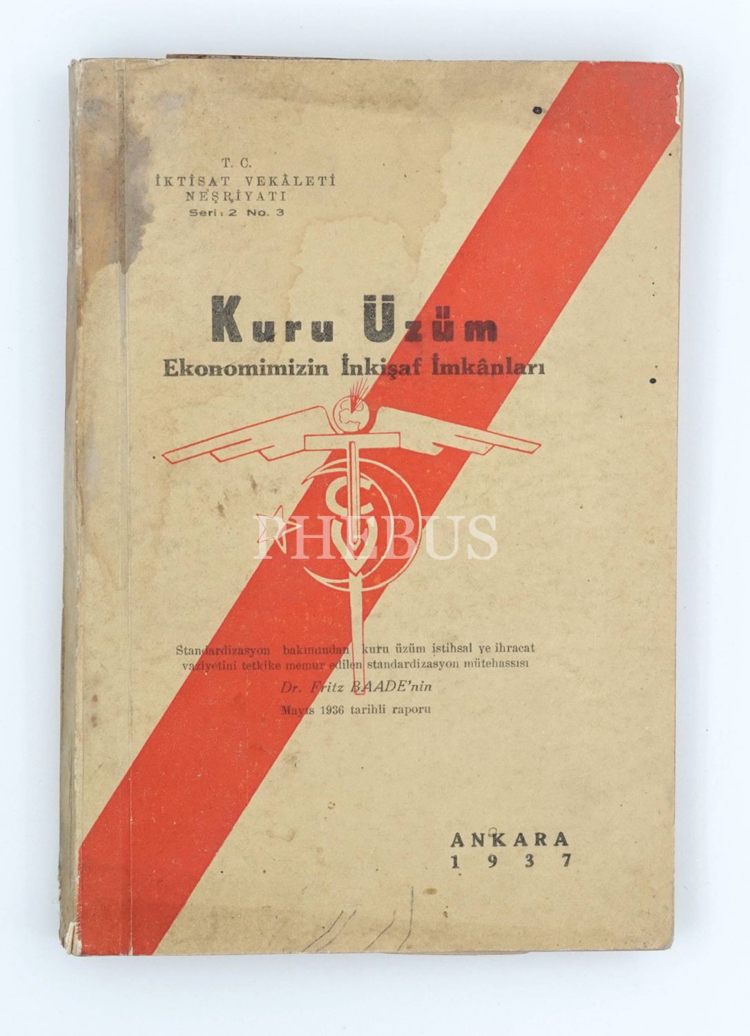 KURU ÜZÜM EKONOMİMİZİN İNKİŞAF İMKÂNLARI (Dr. Fritz Baade´nin Mayıs 1936 tarihli raporu), çeviren: N. Agar, 1937, Ulus Basımevi, Ankara, 254 sayfa, 15x23 cm...