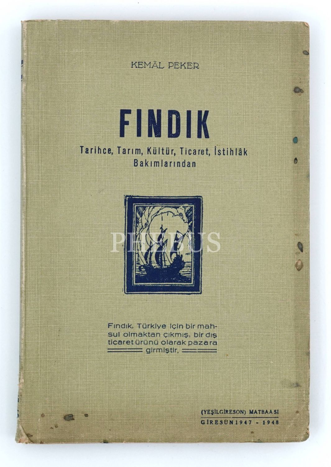FINDIK (Tarihçe, Tarım, Kültür, Ticaret, İstihlâk Bakımlarından), Kemâl Peker, 1948, (Yeşil Gireson) Matbaası, Giresun, 242 sayfa, 17x25 cm...