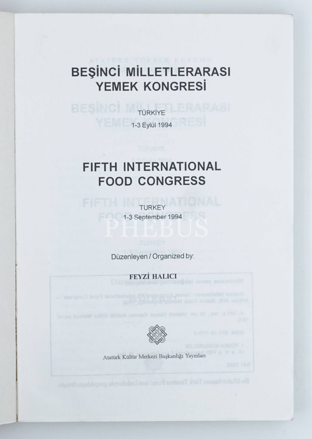 BEŞİNCİ MİLLETLERARASI YEMEK KONGRESİ (Türkiye, 1-3 Eylül 1994), düzenleyen: Feyzi Halıcı, Atatürk Kültür Merkezi Yayınları, 341 sayfa, 17x24 cm...