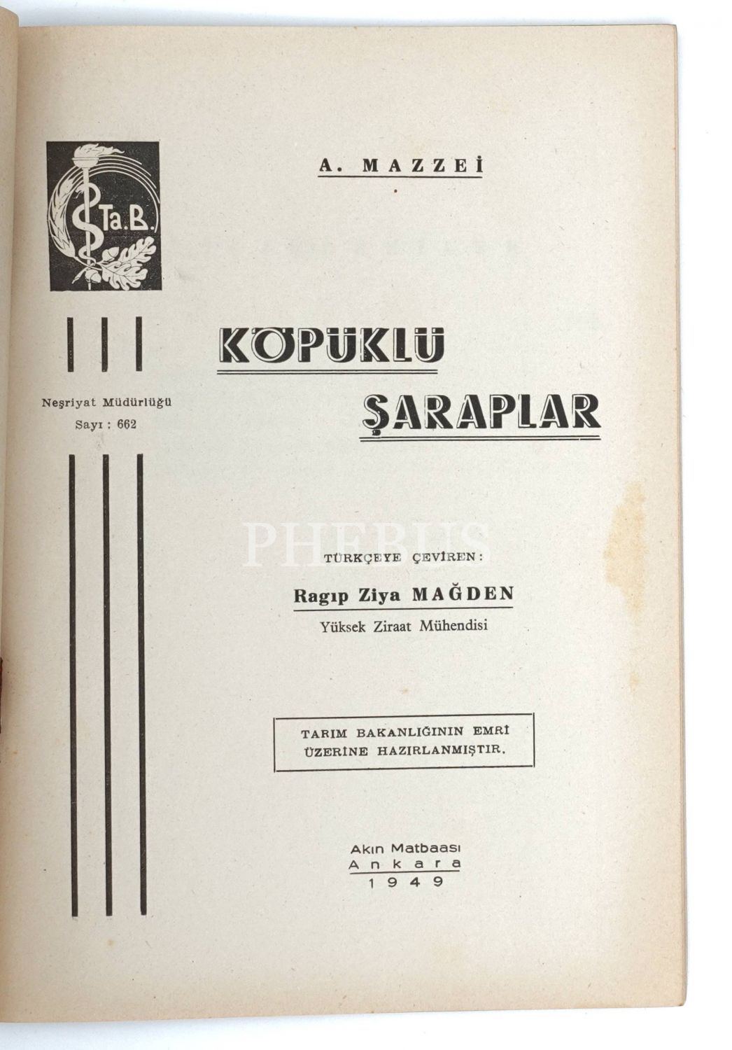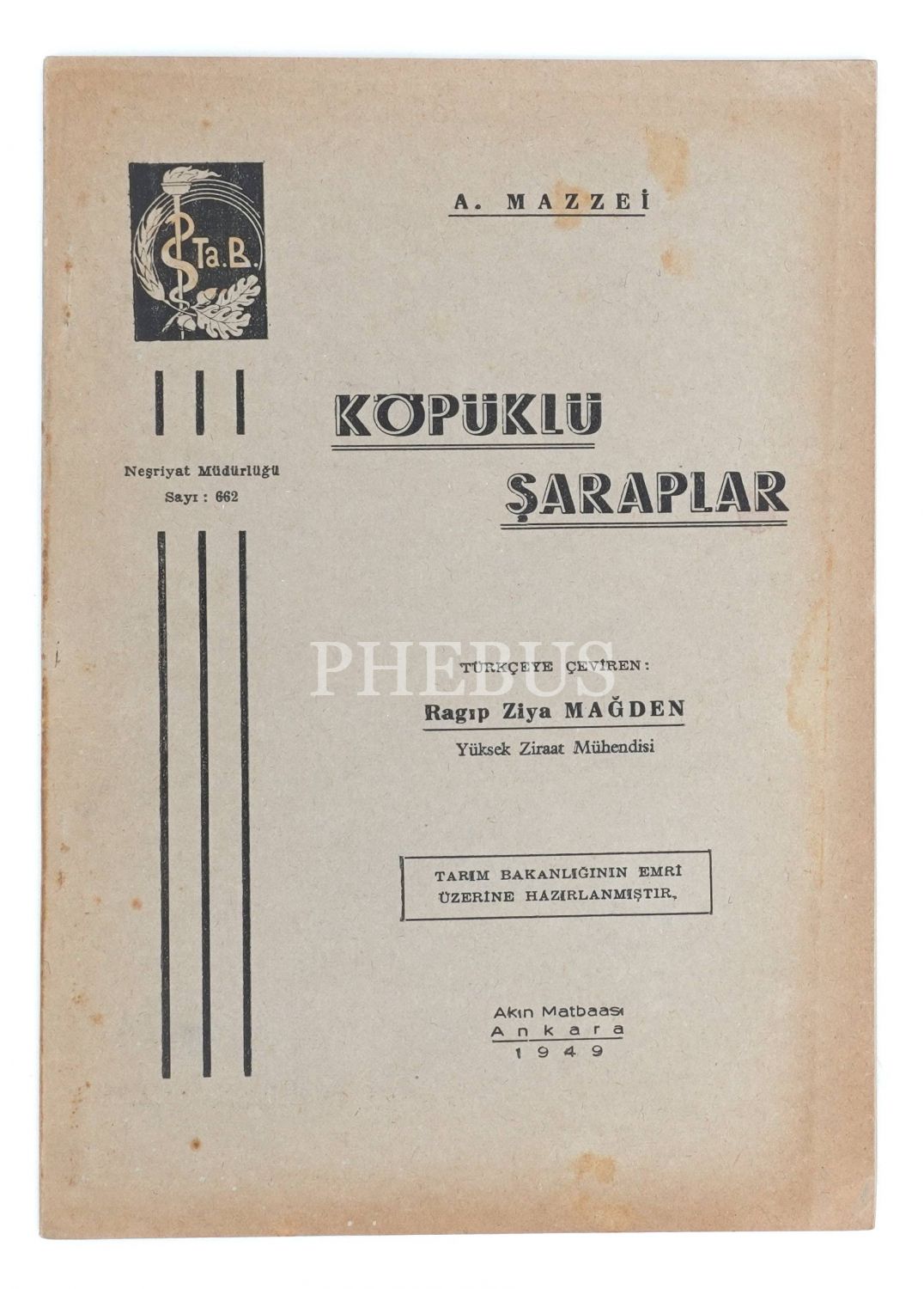 KÖPÜKLÜ ŞARAPLAR, A. Mazzei, Türkçeye çeviren: Ragıp Ziya Mağden, 1949, Akın Matbaası, Ankara, 48 sayfa, 17x24 cm...