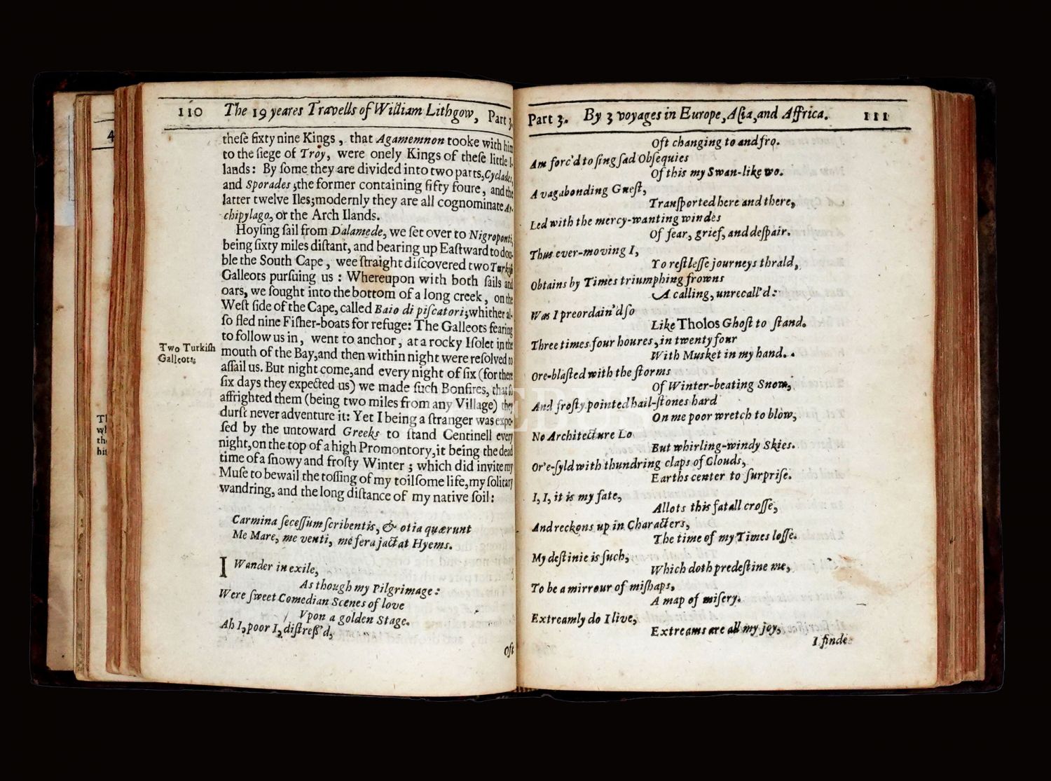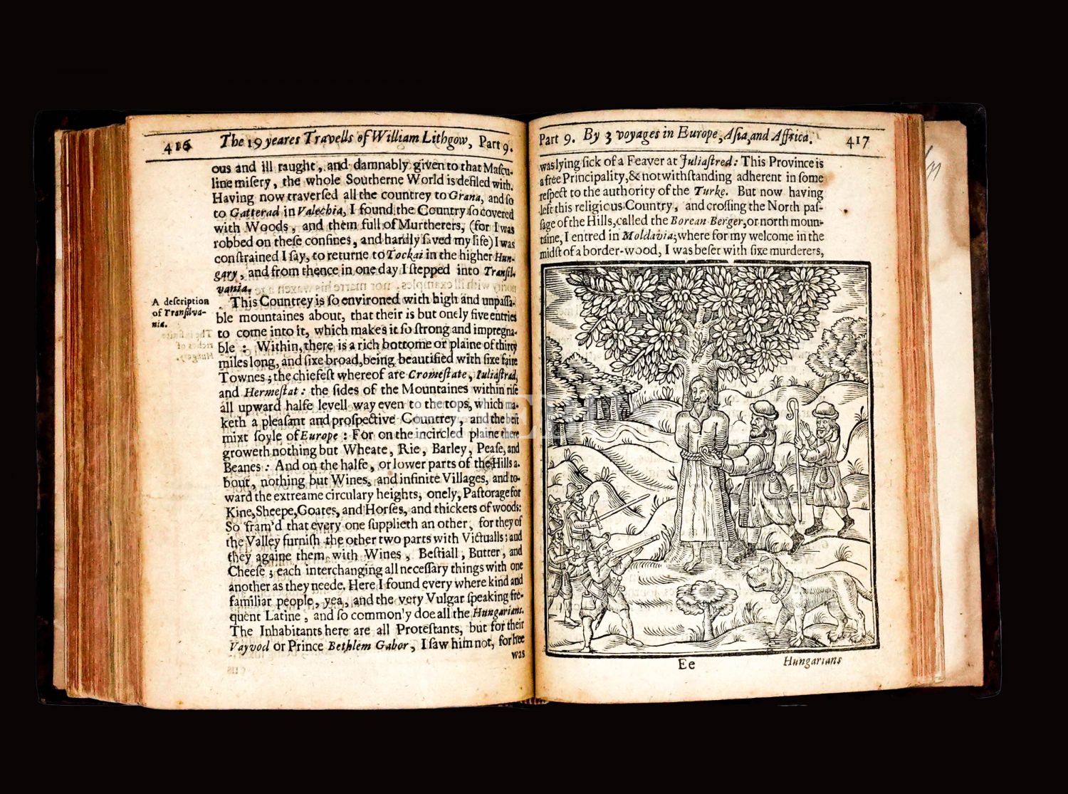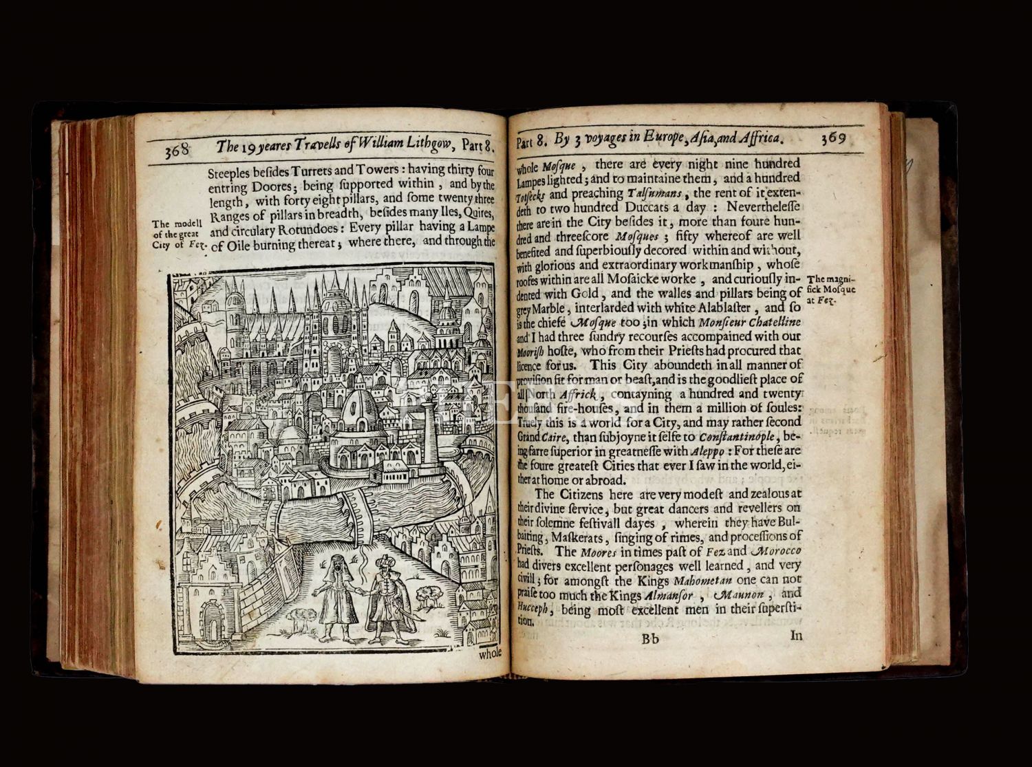 İskoç gezgin William Lithgow´un (1582-1645), 19 yıl boyunca Avrupa, Asya ve Afrika´da "yürüyerek" 36.000 mil katettiğini iddia ettiği seyahatlerini, ahşap oyma baskı gravürler eşliğinde okurlara sunduğu kitabı... "The Societ of Writters to the Signet" kabartma logolu, deri sırtlı cildinde... Sayfa kenarları kırmızı boyalıdır.
