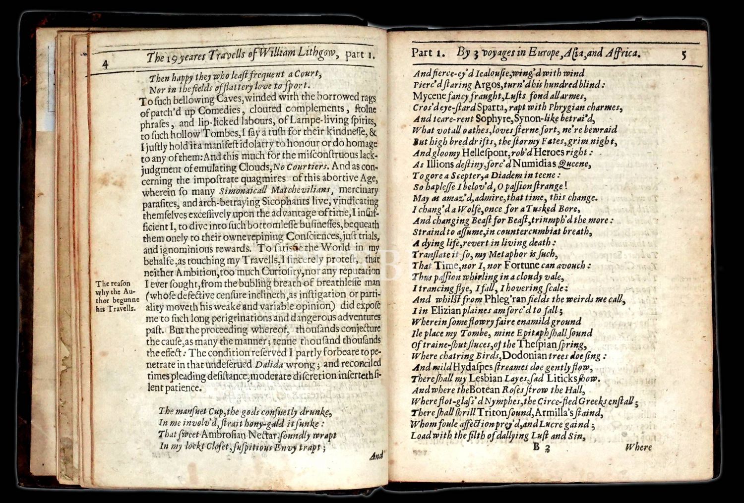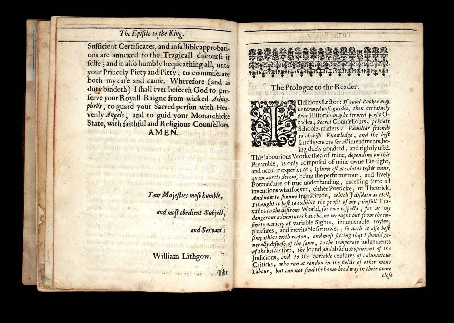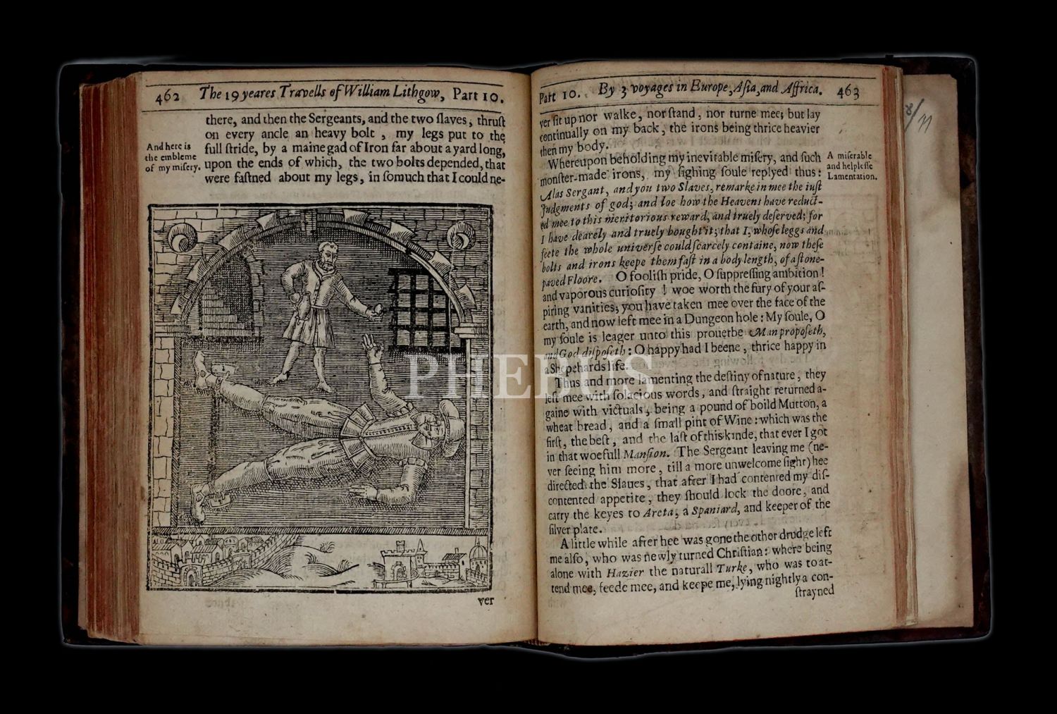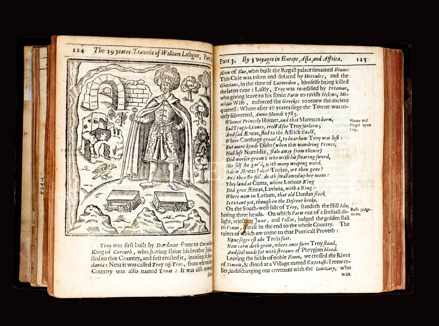 İskoç gezgin William Lithgow´un (1582-1645), 19 yıl boyunca Avrupa, Asya ve Afrika´da "yürüyerek" 36.000 mil katettiğini iddia ettiği seyahatlerini, ahşap oyma baskı gravürler eşliğinde okurlara sunduğu kitabı... "The Societ of Writters to the Signet" kabartma logolu, deri sırtlı cildinde... Sayfa kenarları kırmızı boyalıdır.