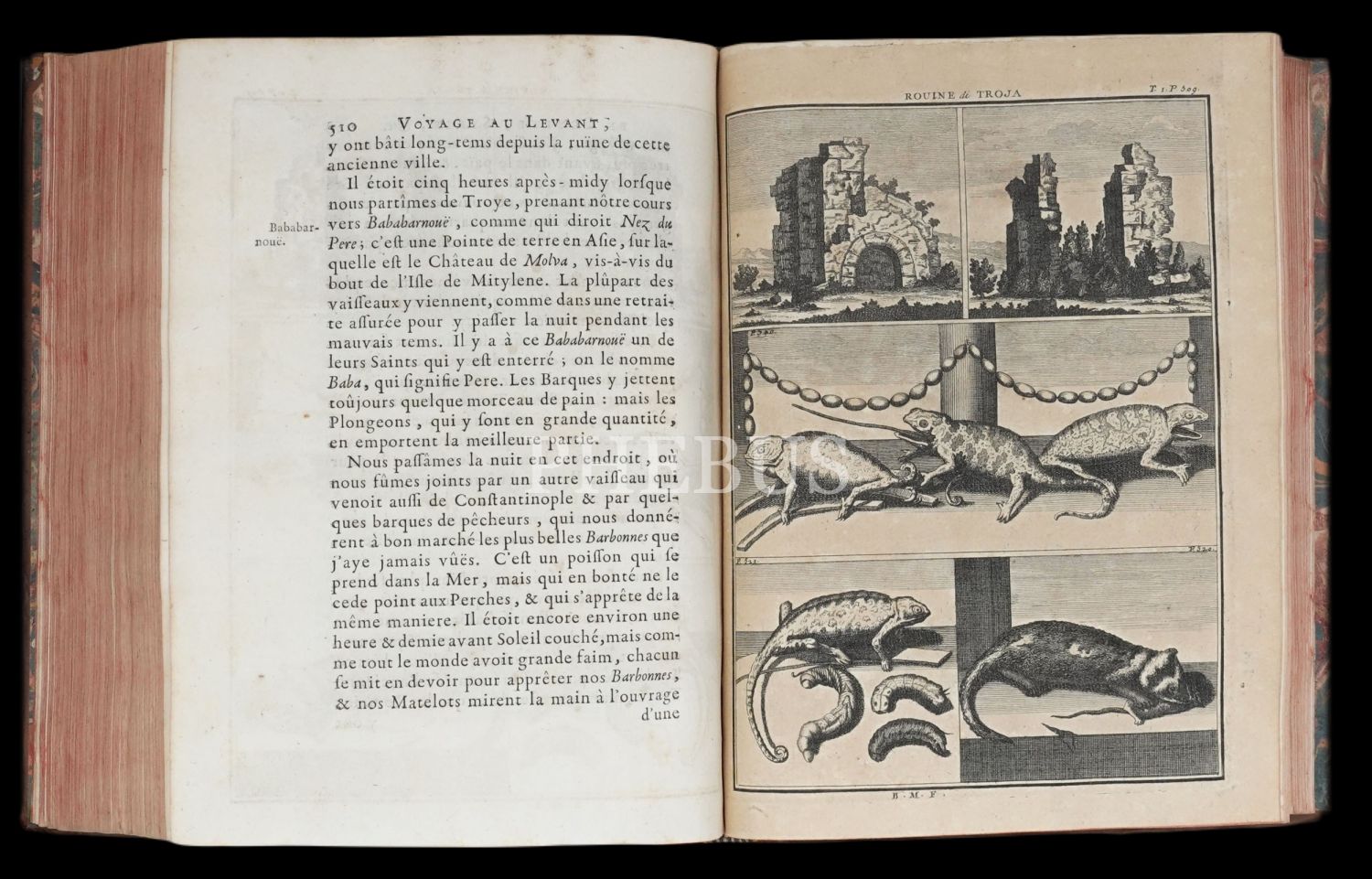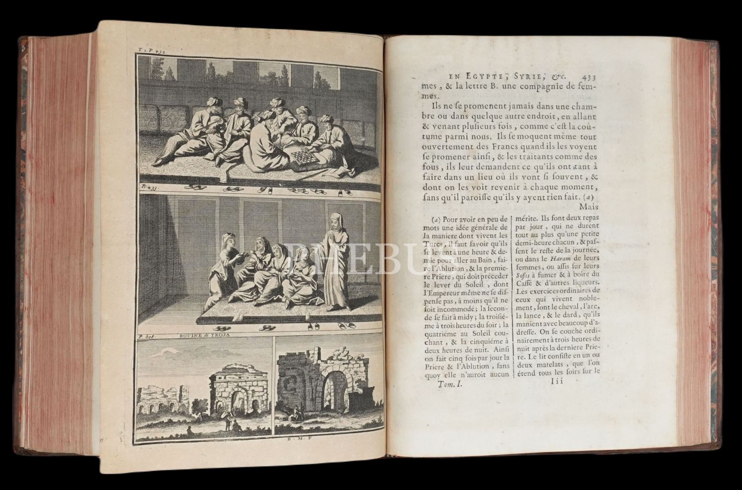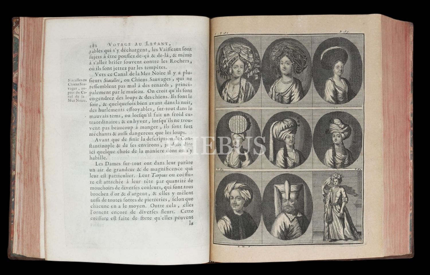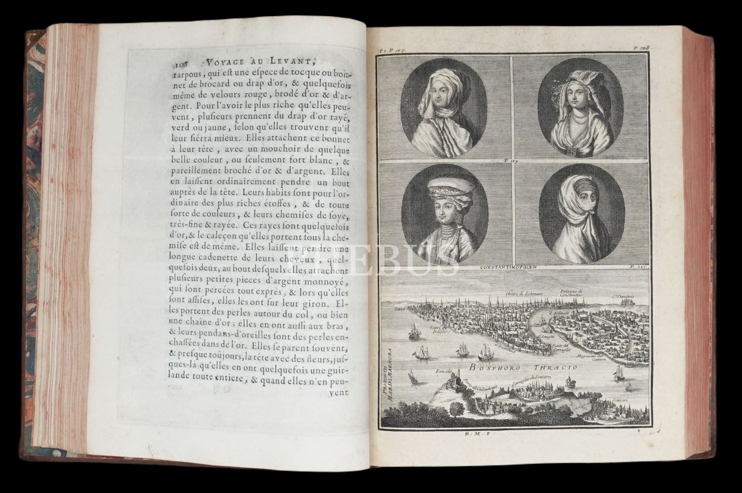 Hollandalı gezgin Cornelis de Bruyn´un (1652-1727), 1678 yılında çıktığı ve 1684 yılında tamamladığı Osmanlı İmparatorluğu ve çevresini kapsayan 6 yıllık İstanbul, Küçük Asya, Kariye, Rodos, Mısır, Suriye ve Kutsal Topraklar seyahati gözlemlerini, harikulade gravürlerle yansıtan meşhur seyahatnamesi... Döneminin, iç kapakları ebrulu, tümüyle deri ciltleri içinde... Sayfa kenarları kırmızı boyalıdır.