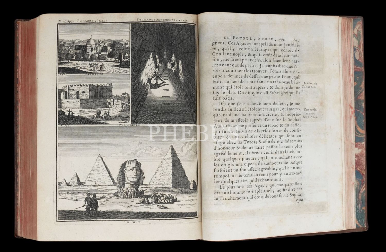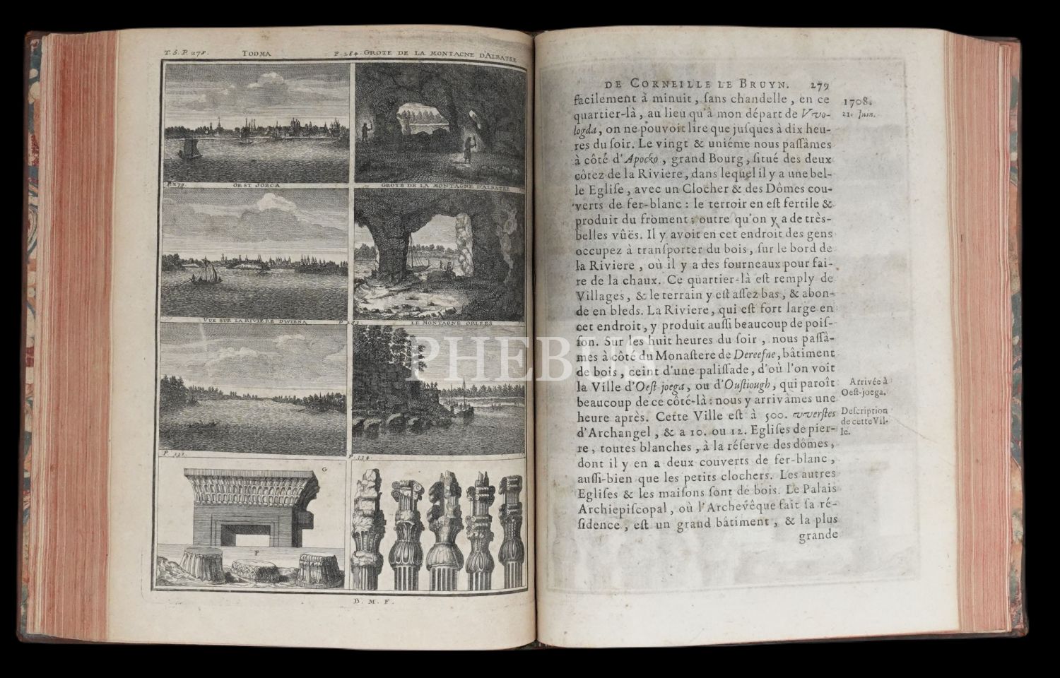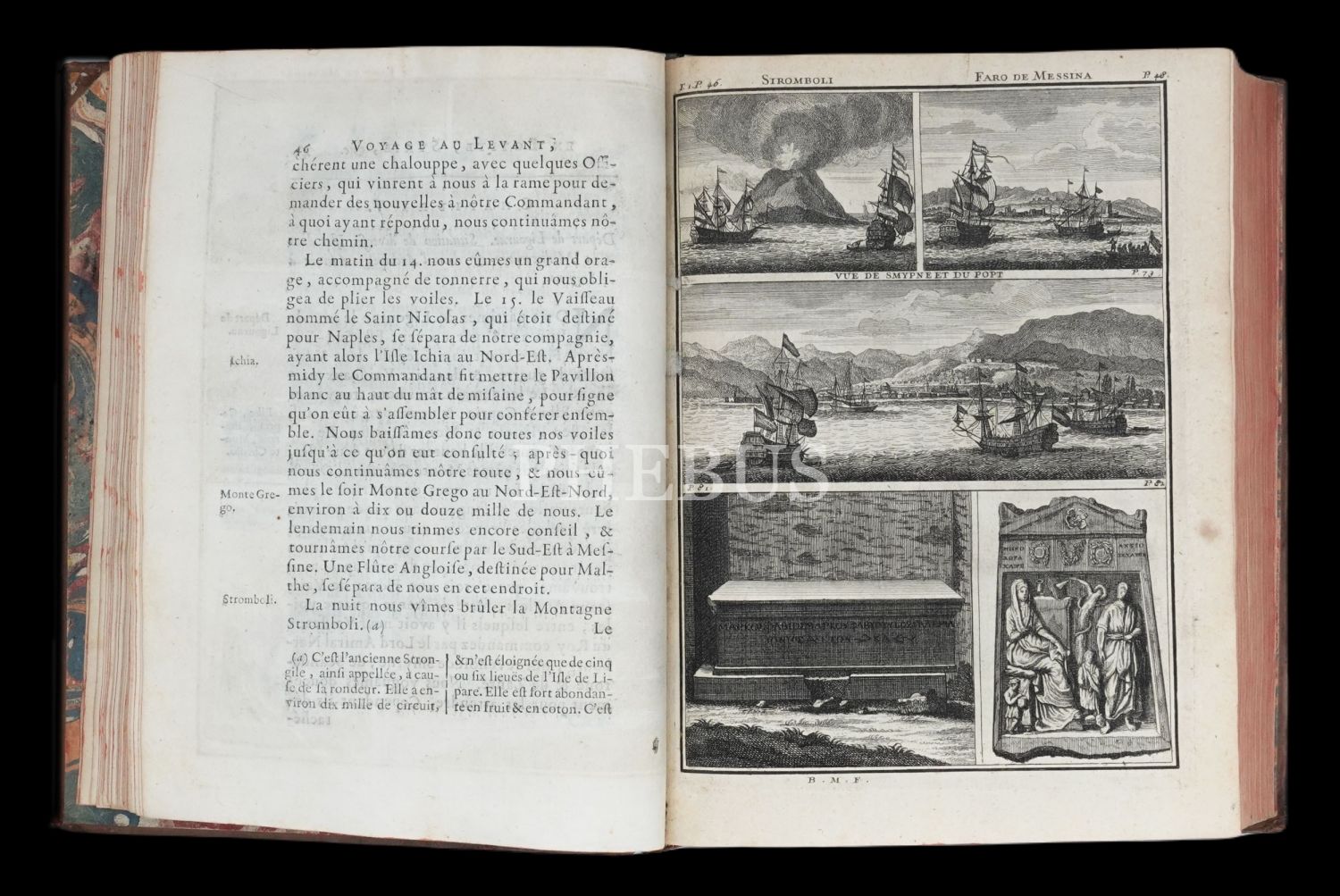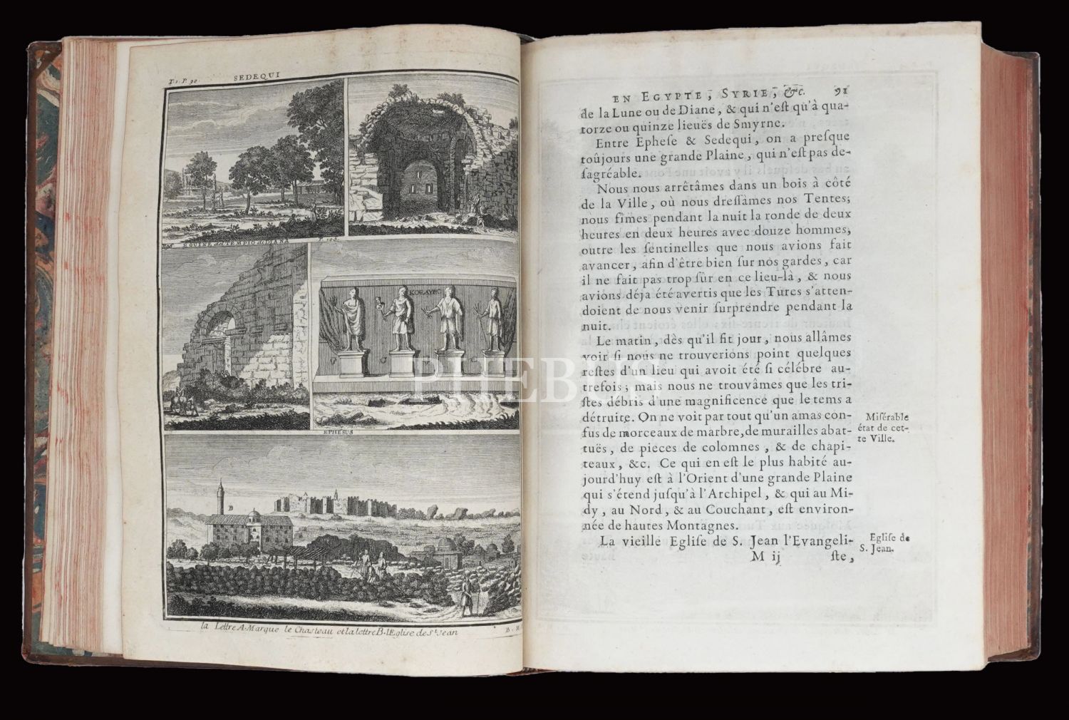 Hollandalı gezgin Cornelis de Bruyn´un (1652-1727), 1678 yılında çıktığı ve 1684 yılında tamamladığı Osmanlı İmparatorluğu ve çevresini kapsayan 6 yıllık İstanbul, Küçük Asya, Kariye, Rodos, Mısır, Suriye ve Kutsal Topraklar seyahati gözlemlerini, harikulade gravürlerle yansıtan meşhur seyahatnamesi... Döneminin, iç kapakları ebrulu, tümüyle deri ciltleri içinde... Sayfa kenarları kırmızı boyalıdır.
