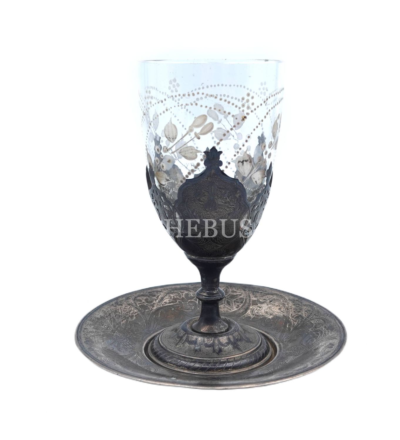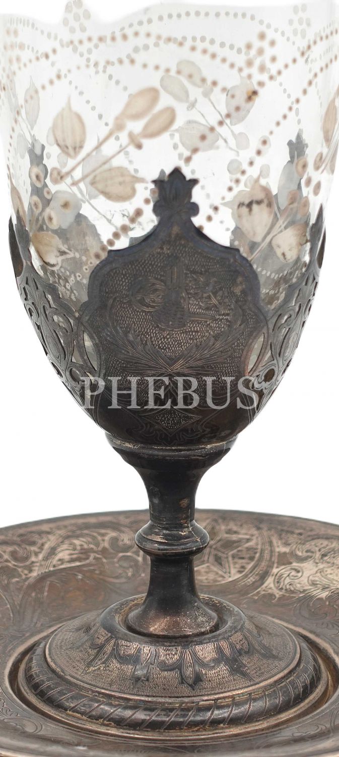 Tuğralı, sah damgalı, Osmanlı kalem işi arma ve floral desenlerin yer aldığı kadeh ve tabağı, tabak çapı: 14 cm, kadeh boyu: 16 cm