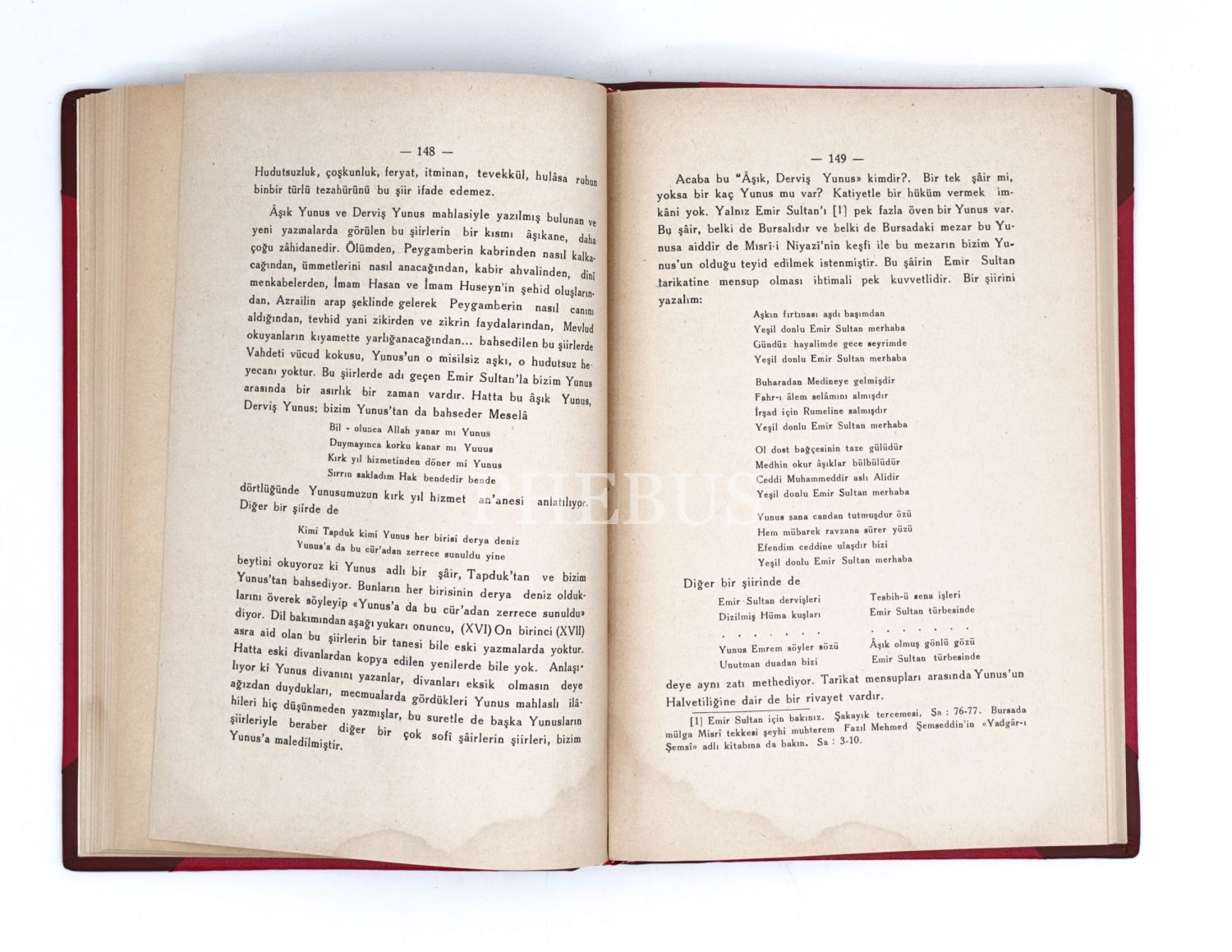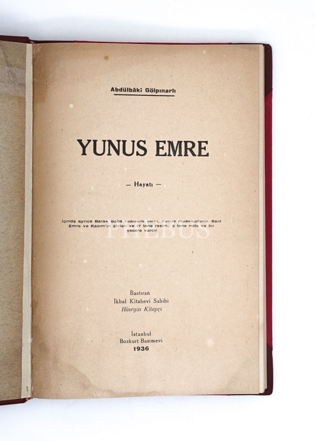 Cumhuriyet sonrasında başta Fuad Köprülü ve Abdülbaki Gölpınarlı olmak üzere, dönemin aydınları arasında uzun süren tartışmalara konu olan Yunus Emre`nin kimliği, dini anlayışı, yaşadığı dönem ve şiirleri hakkındaki tartışmaları ateşleyen kitap... "İçinde ayrıca Barak Baba risalesile şerhi, Yunus muakkiplerile Said Emre ve Kasım`ın şiirleri ve 17 tane resim, 8 tane nota ve bir şecere vardır." *Ön ve arka kapakları korunarak yapılmış, deri sırtlı, şık yeni cildi içinde...