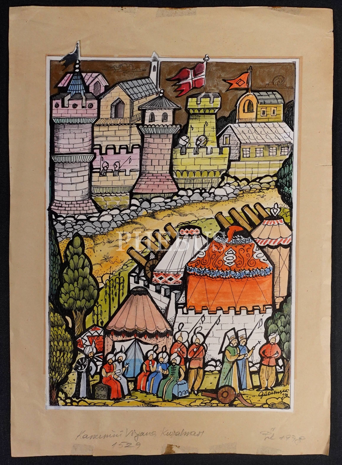 Ünlü grafiker Gülümser Aral imzalı Kanuni Sultan Süleyman´ın Viyana Kuşatması çalışması, 19x27 cm...