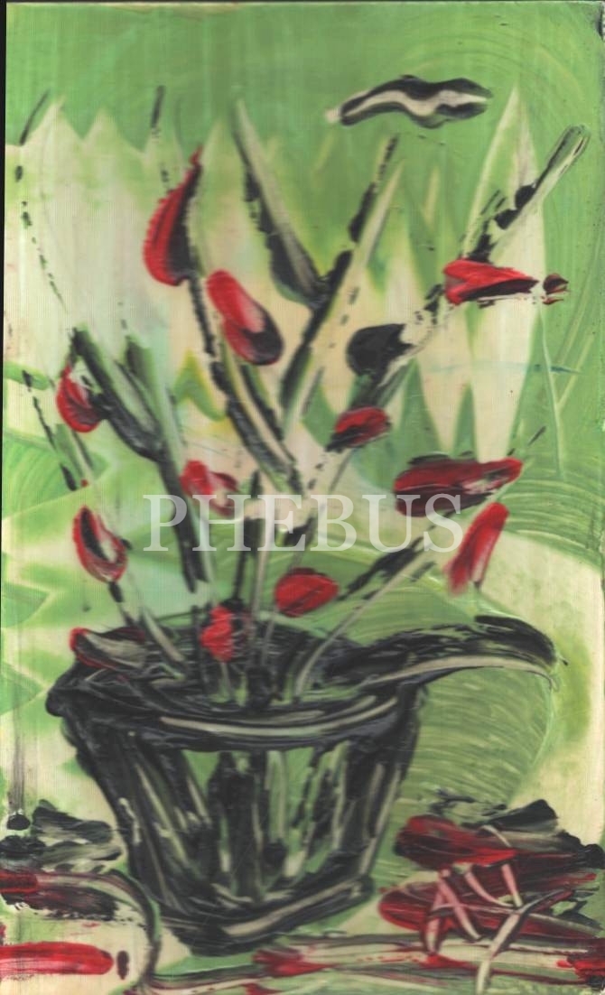 Metin Eloğlu´nun "Ali" imzasıyla yağlıboya saksı içinde çiçek çalışması, 9x14 cm