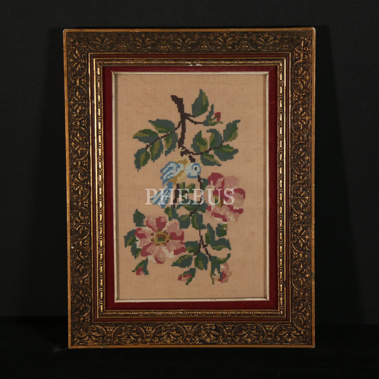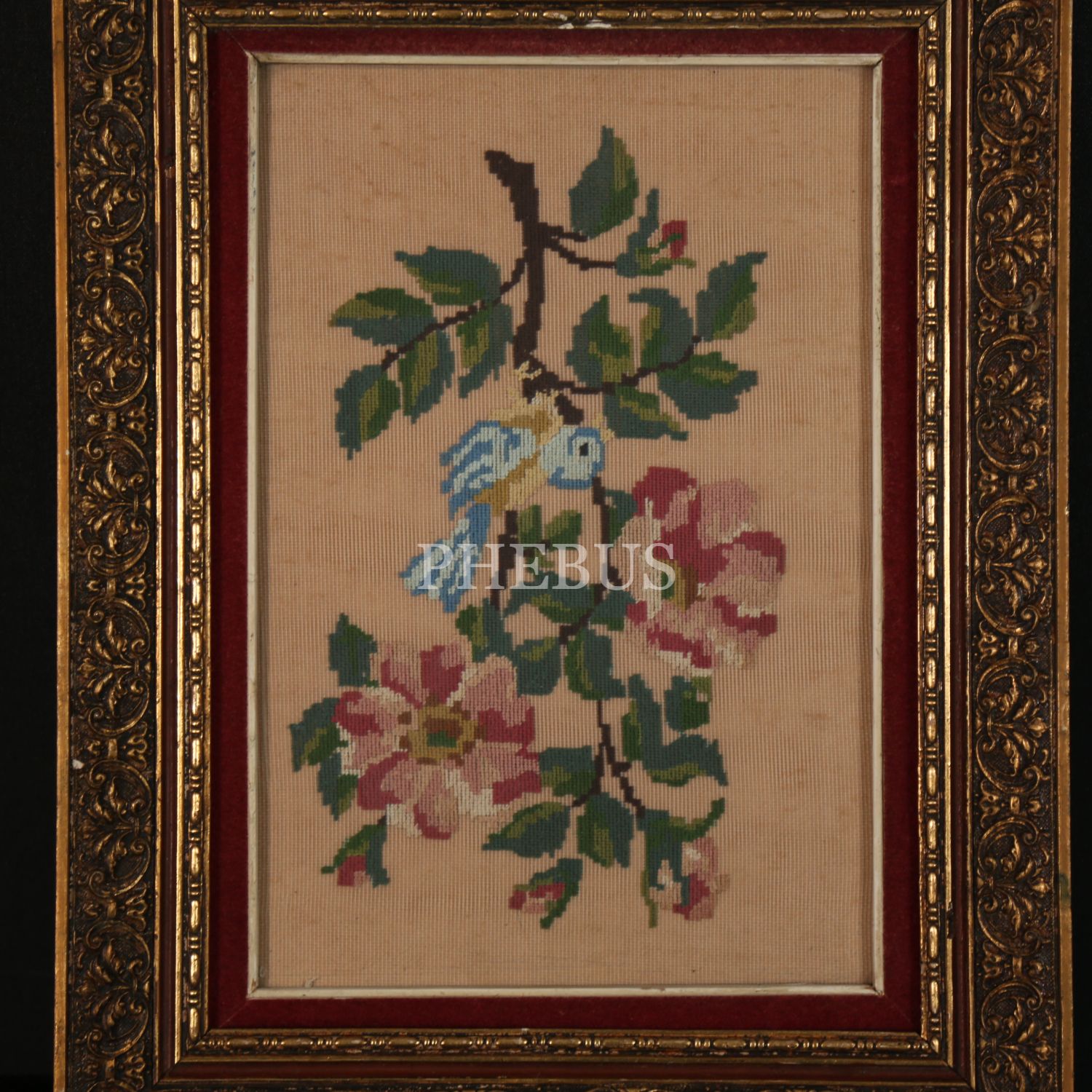 Tül üzerine kanaviçe tekniğiyle işlenmiş çiçek çalışması, çerçevesiyle birlikte 32x42 cm...