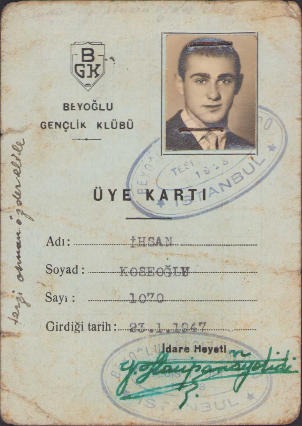 Beyoğlu Gençlik Kulübü üye kartı, 1947 tarihli, İstanbul Beyoğlu adresli, haliyle