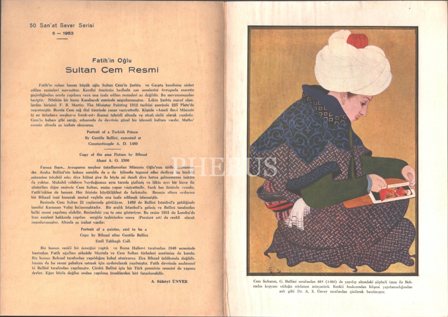 50 Sanat Sever Serisi´nin 1953 tarihli "Fatih´in Oğlu Sultan Cem Resmi" başlıklı 5. sayısı, A. S. Ünver, 2 sayfa, 17x25 cm...