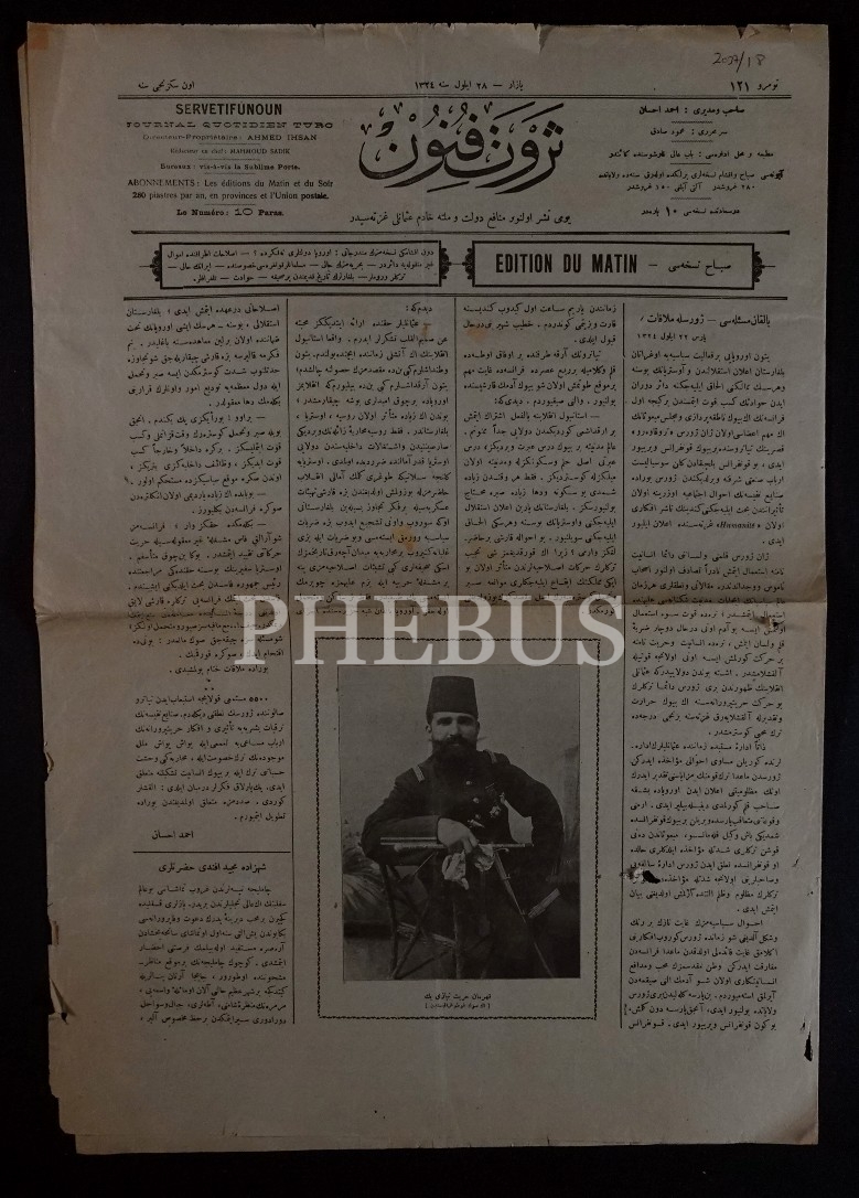 Kahraman-ı Hürriyet Resneli Niyazi görselli, "Balkan Meselesi" konulu, SERVET-İ FÜNUN´un günlük gazete formunda yayınlanan 28 Eylül 1324 tarihli sayısı, 4 sayfa, 35x50 cm...
