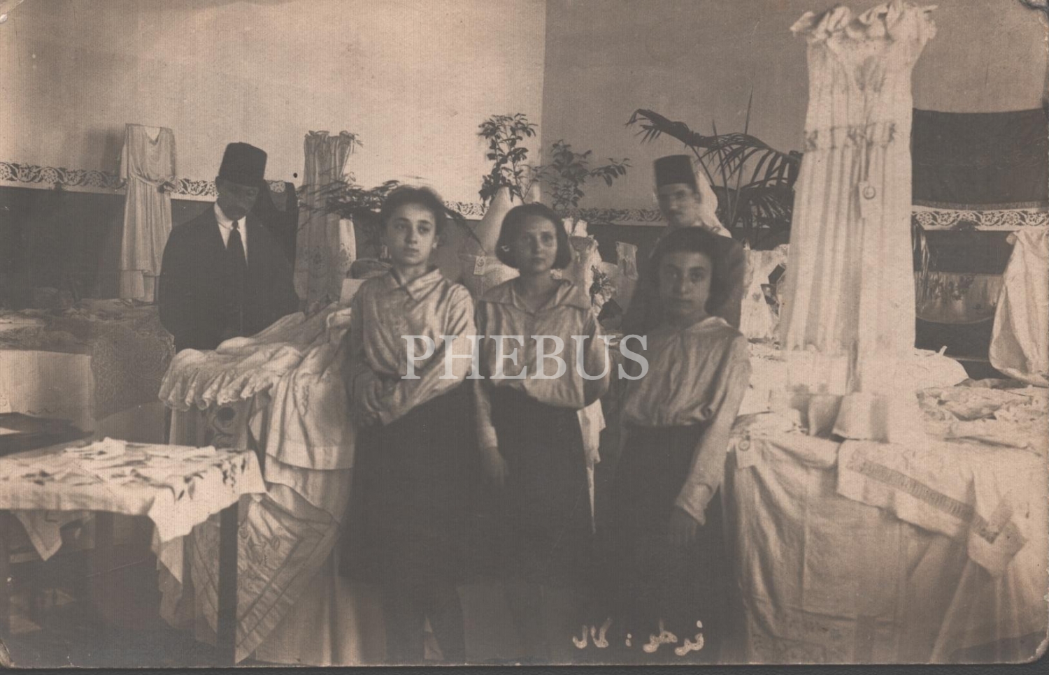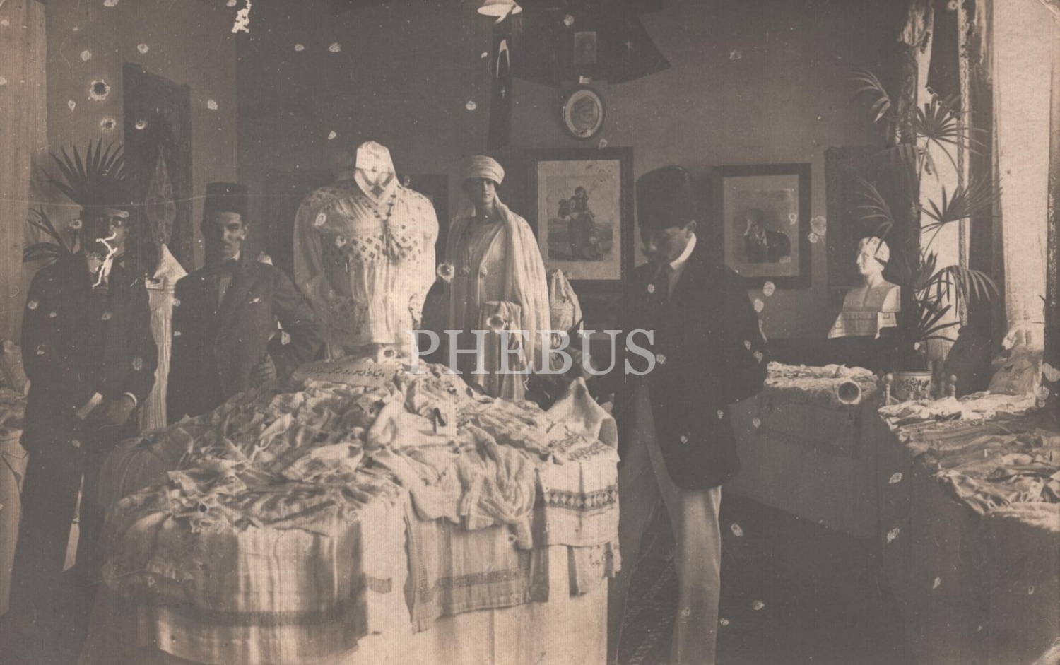 Osmanlı´da bir kumaş sergisini gezen fesli beyefendiler ve küçük hanımlar, 14x9 cm...