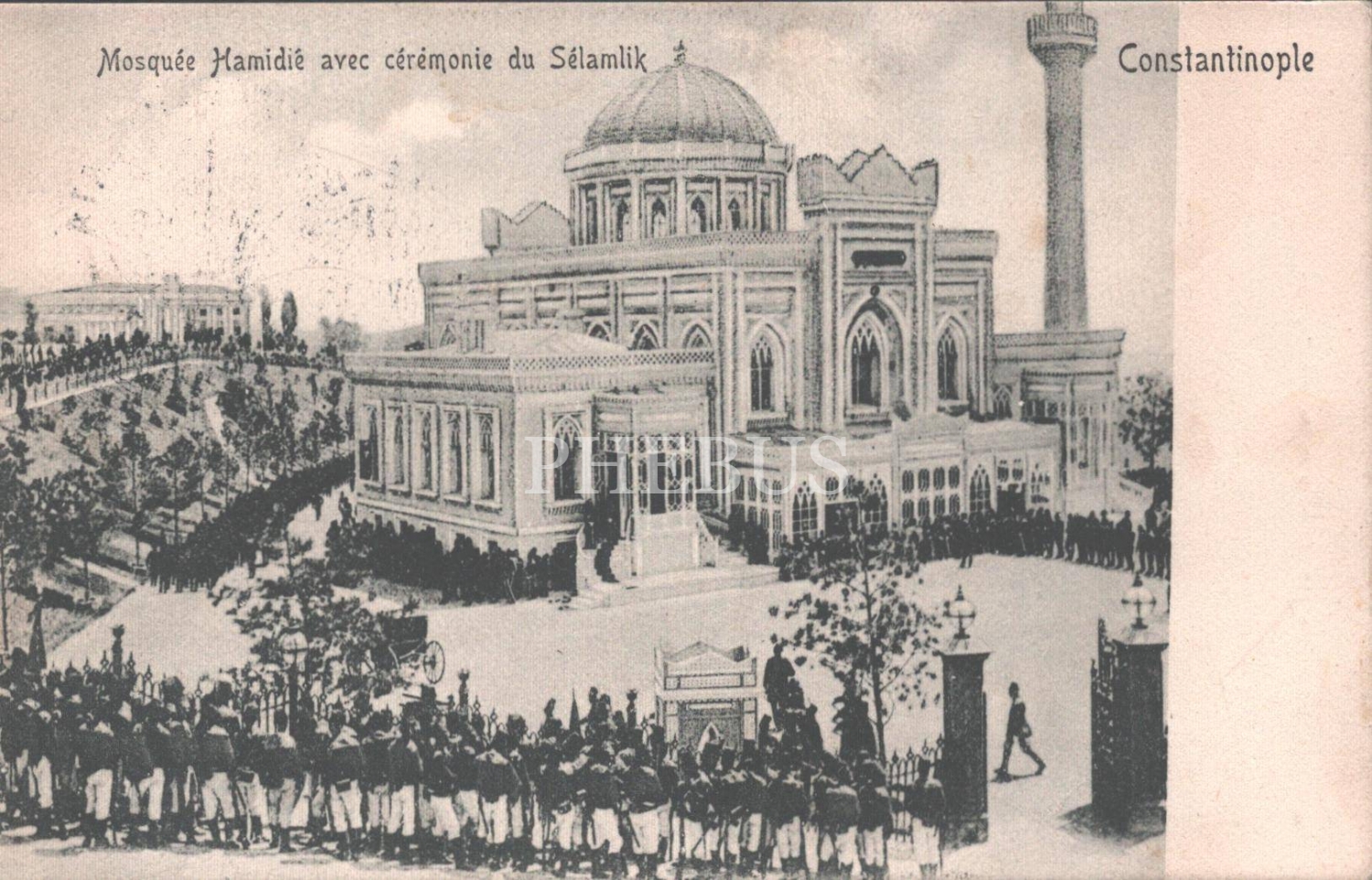 Yıldız Hamidiye Cami´nde selamlık merasimi, "Mosquée Hamidiye avec ceremonie du Selamlık", ed.: Au Bon Marche (Pera), 14x9 cm...
